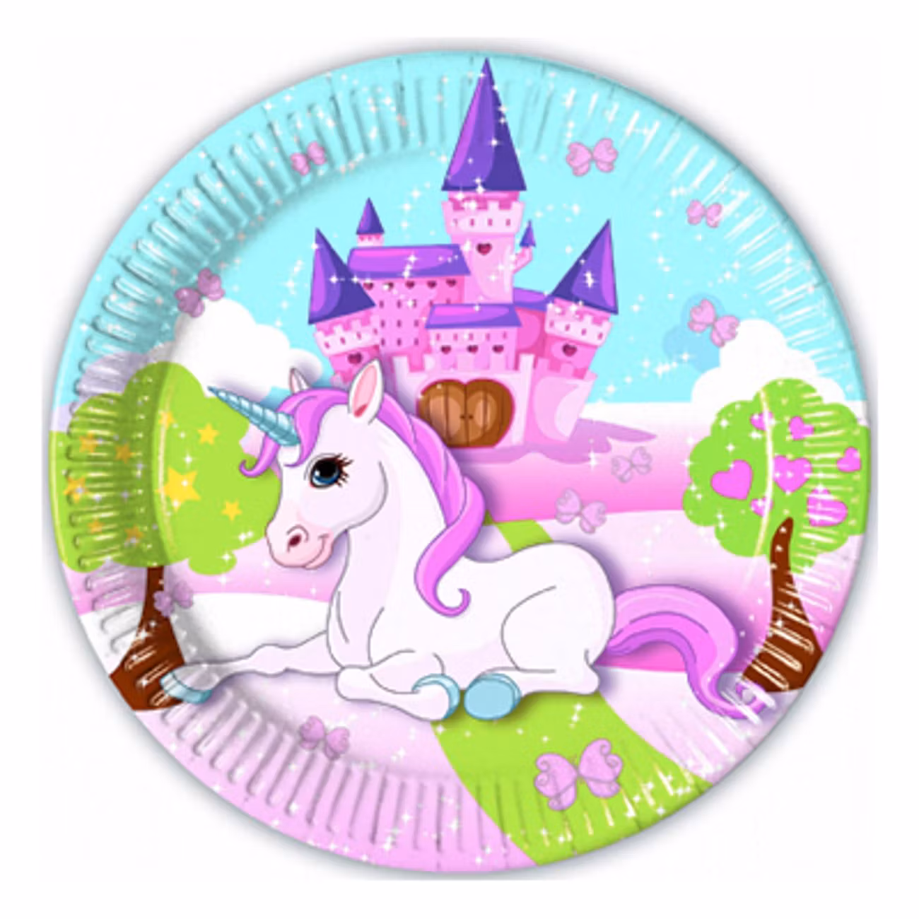 Papperstallrikar Unicorn Party kommer i en förpackning med åtta stycken tallrikar tillverkade i papp. På tallrikarna finns en vit enhörning, ett rosa slott, träd och fjärilar. Tallrikarna passar bra till barnkalas, dop, namngivningskalas och sommarfester.