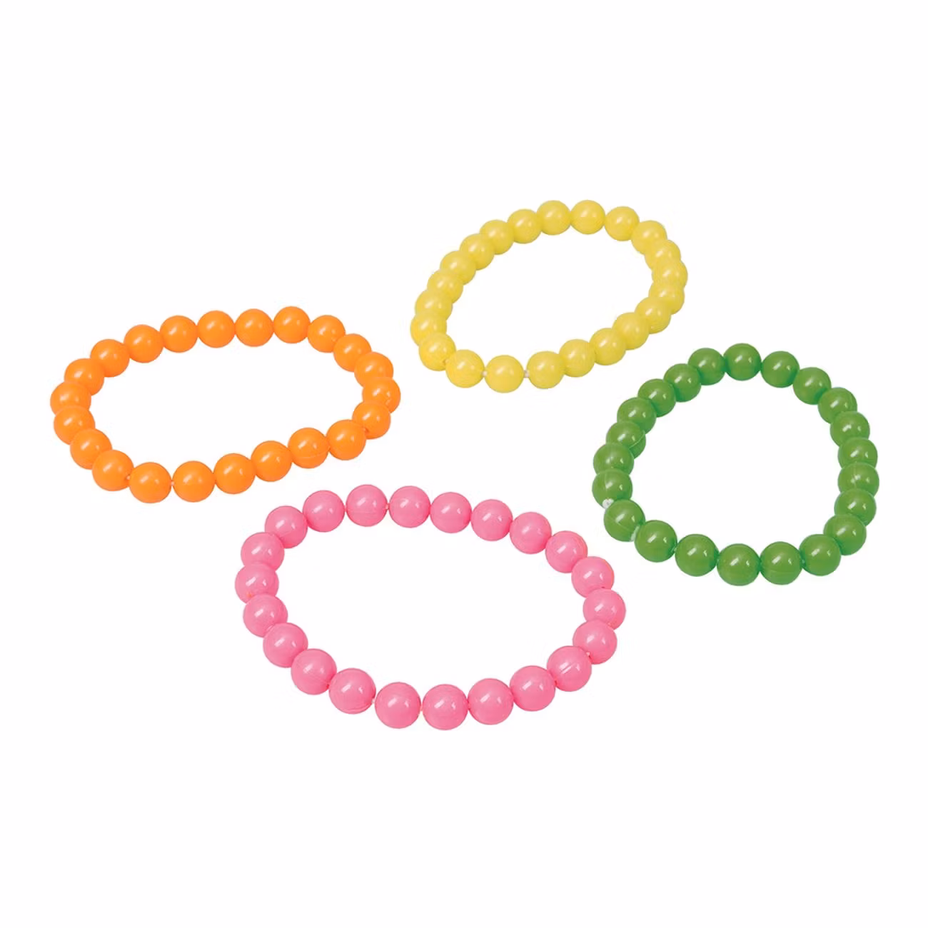 Pärlarmband Neon inkluderar fyra stycken armband med pärlor i plast. Armbanden har olika färger: Gul, orange, rosa och grön.