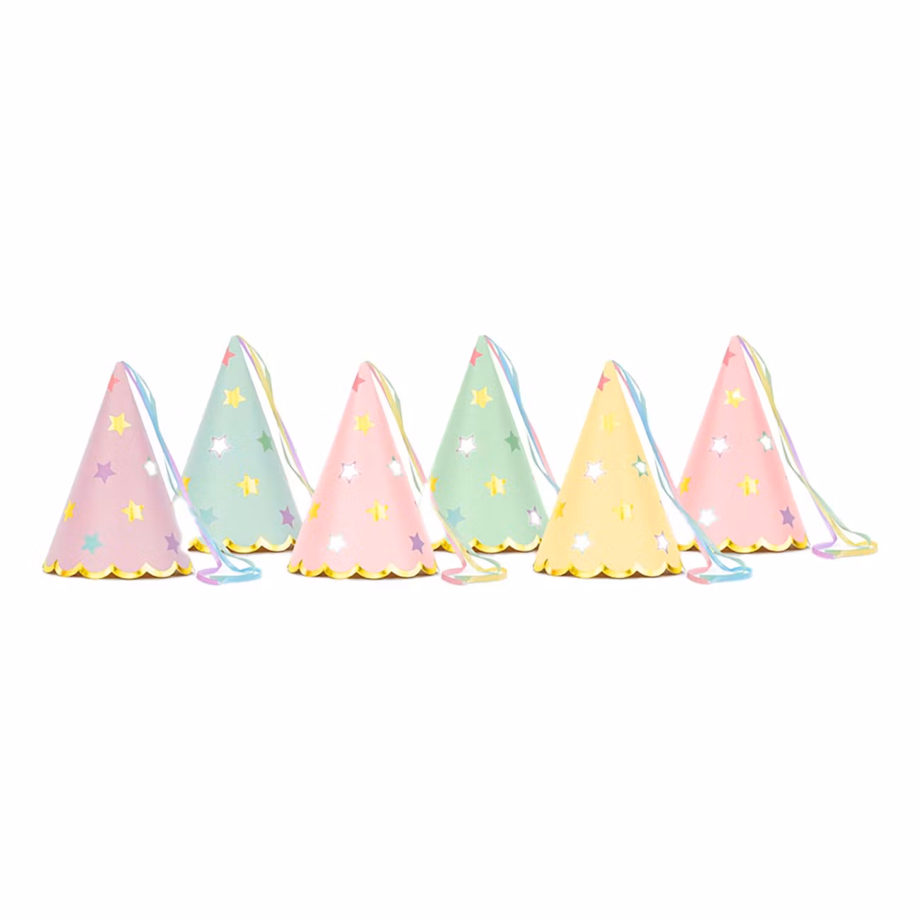 Partyhattar Pastell med Stjärnor är ett gäng superfina kalashattar i pastellfärger med skimrande stjärnor, guldskimrande kanter och långa flerfärgade band på toppen. Partystämning? Det kan du lita på!