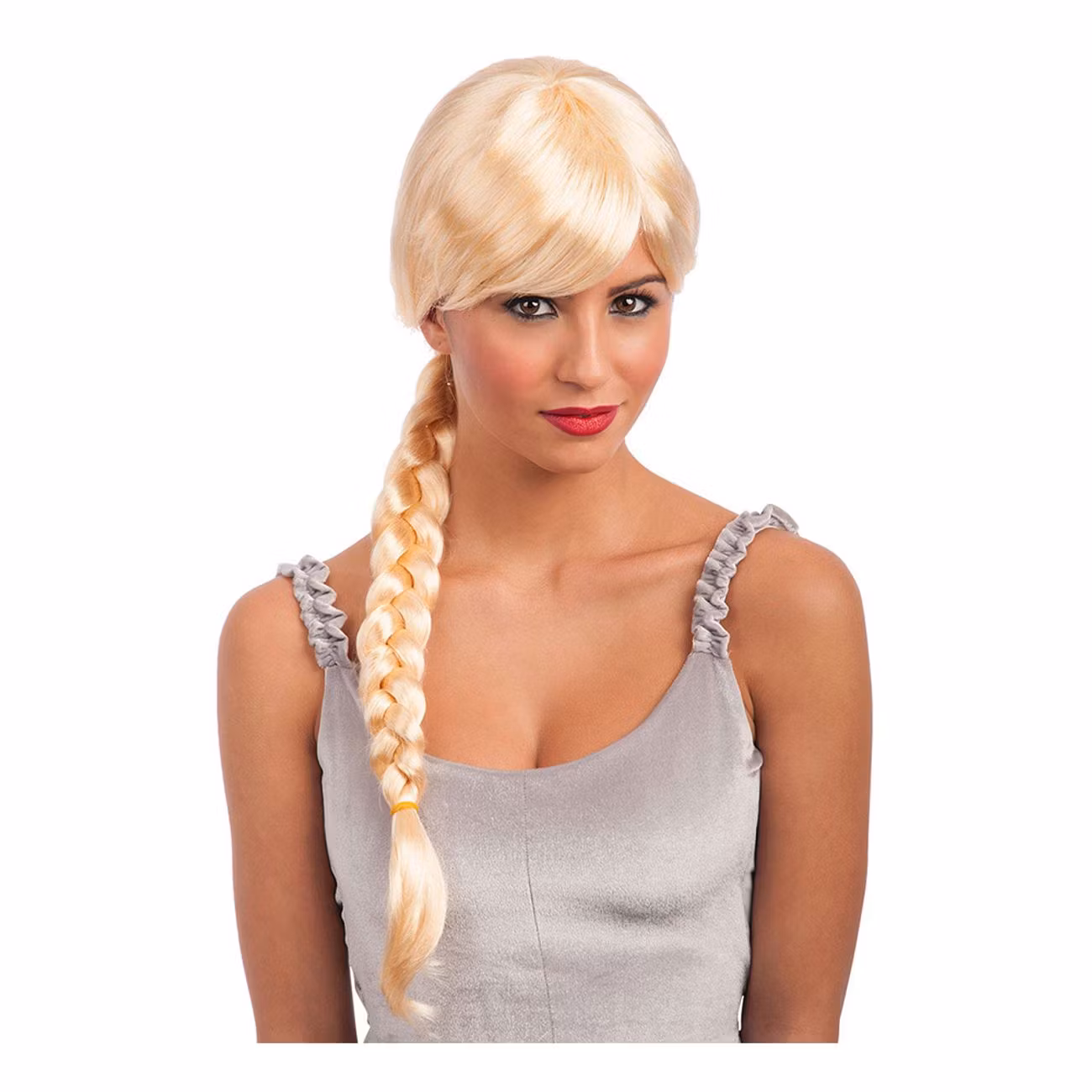 Peruk Ljusblond med Lång Fläta gör dig till en långhårig blondin på nolltid! Endast peruken medföljer, vi rekommenderar därför att du kompletterar peruken med ett hårnät, så sitter den bättre.