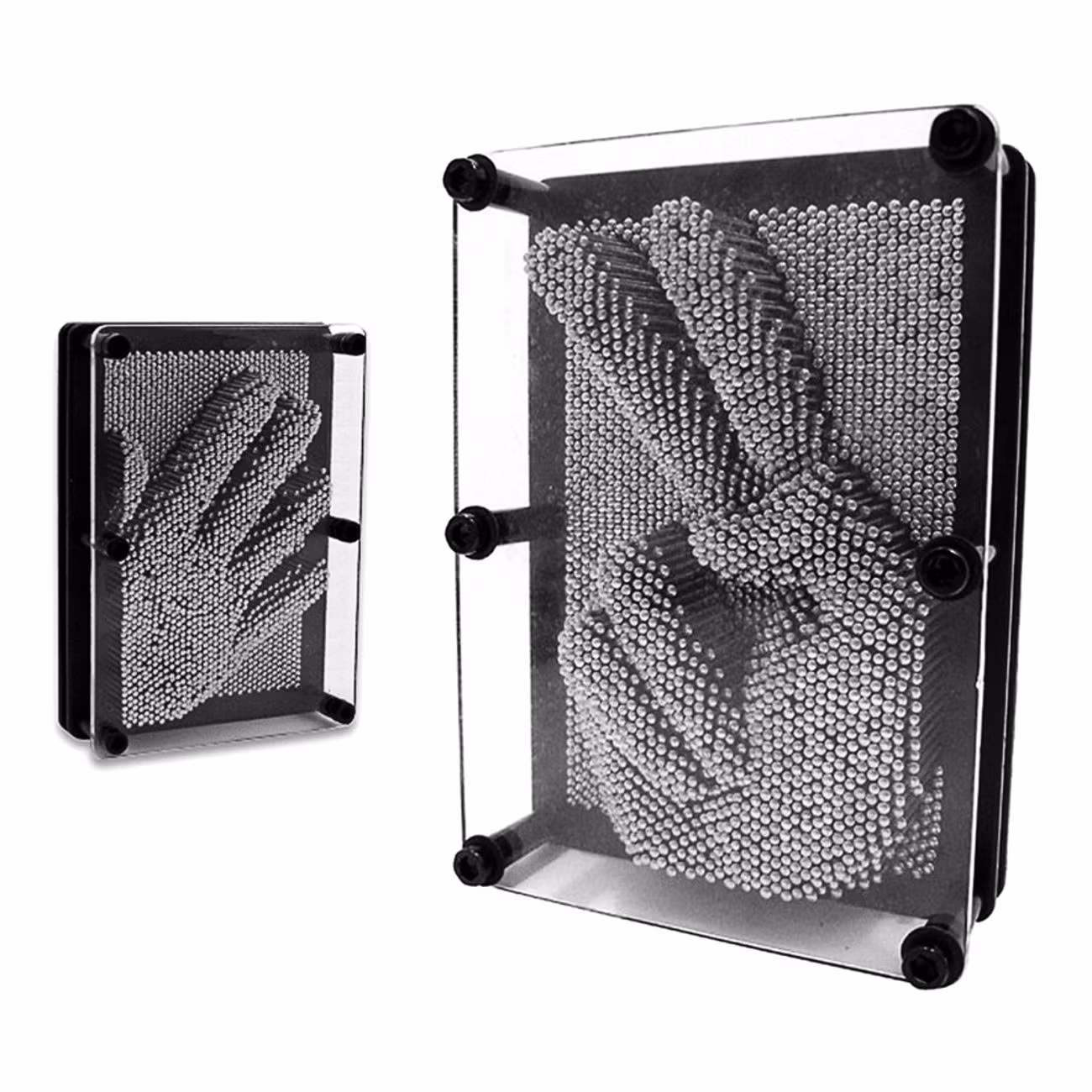 Pin Art XL är en riktigt rolig produkt som består av hundratals (om inte 1000-tals) små metallpiggar som skapar roliga 3D-uttryck med hjälp av din kreativitet. Du kan exempelvis trycka in ansiktet, som modellen på bilden, för att sedan titta på baksidan. Eller varför inte göra roliga tecken med handen? Pin Art-produkten är tillverkad av metall och ABS-plast tillsammans med plexiglas. Den totala vikten uppgår till cirka 845 gram och måttet är 20,5 x 4,5 x 15,2 cm.