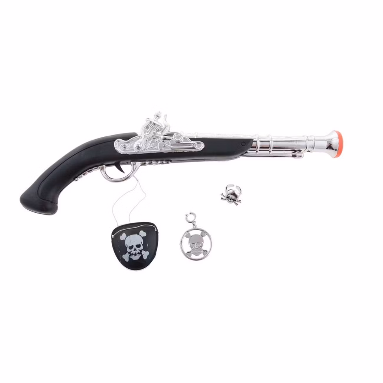 Pirat Leksaksset inkluderar en piratpistol i plast som knäpper när man drar i avtryckaren. Leksakspistolen är ca 40 cm stor. I förpackningen ingår även en piratring i plast, en svart ögonlapp och ett fejkörhänge i plast. Allt med coola döskallar på! Leksakerna är lämpliga från 3 år.
