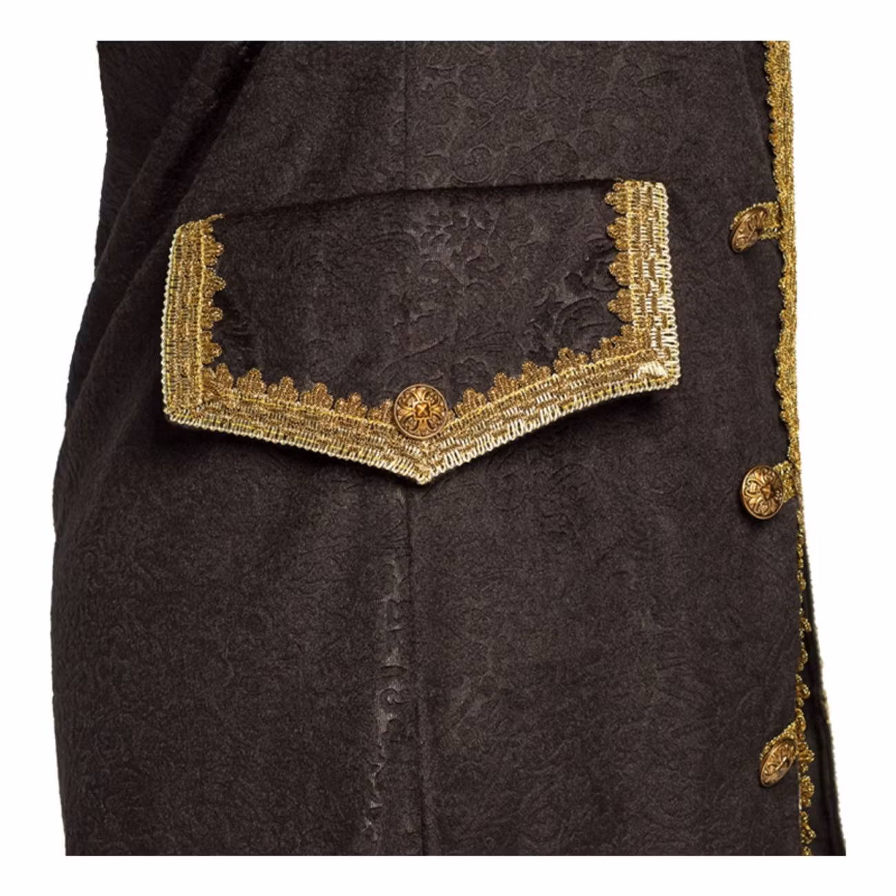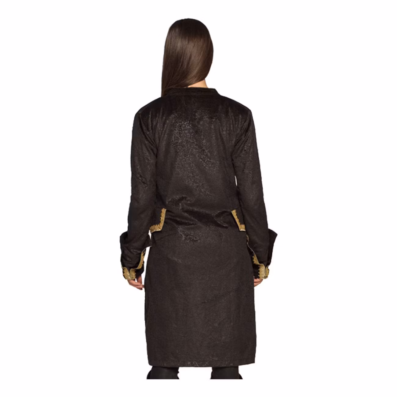 Piratjacka Dam är en lång brun piratjacka med sammetsmönster samt guldfärgade detaljer och knappar. På jackan sitter två stycken fuskfickor. Jackan är tillverkad i polyester och finns i tre storlekar till damer. Det är bara piratjackan som ingår, inget annat som syns på bilden.