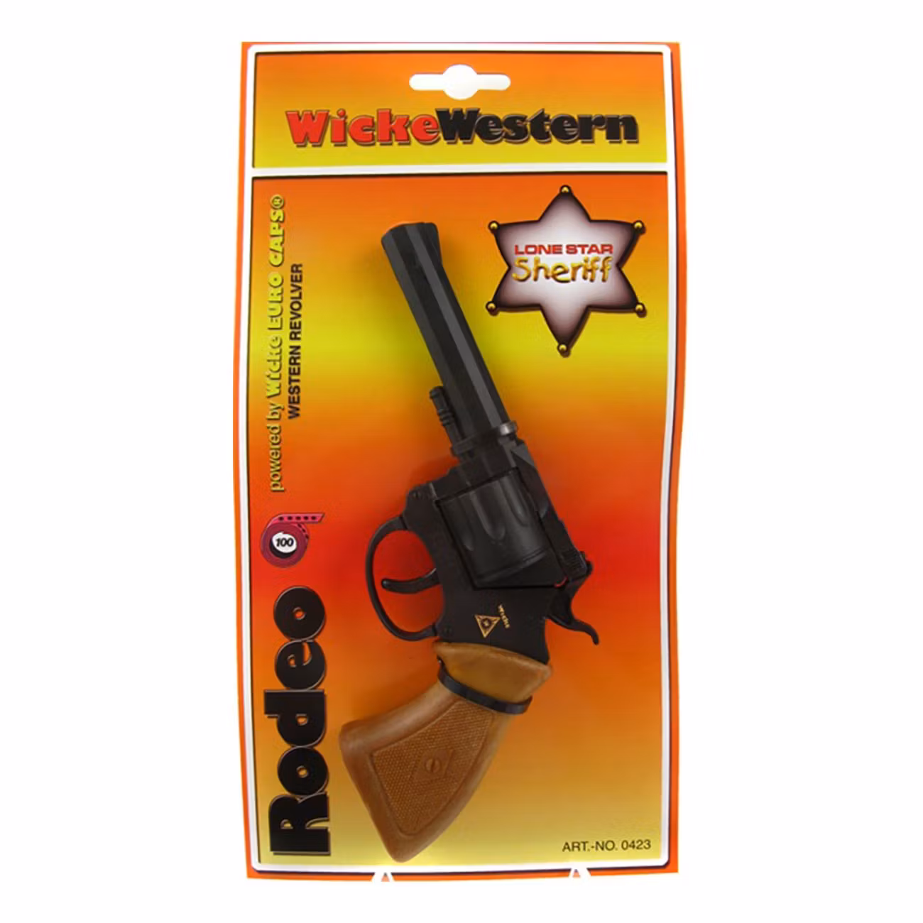 Pistol Rodeo 100-skotts är en svart och brun leksakspistol tillverkad i plast. Den är 20 cm stor. Till pistolen passar 100-skotts knallpulver som kan köpas till separat. Var försiktig och skydda ögon och öron.