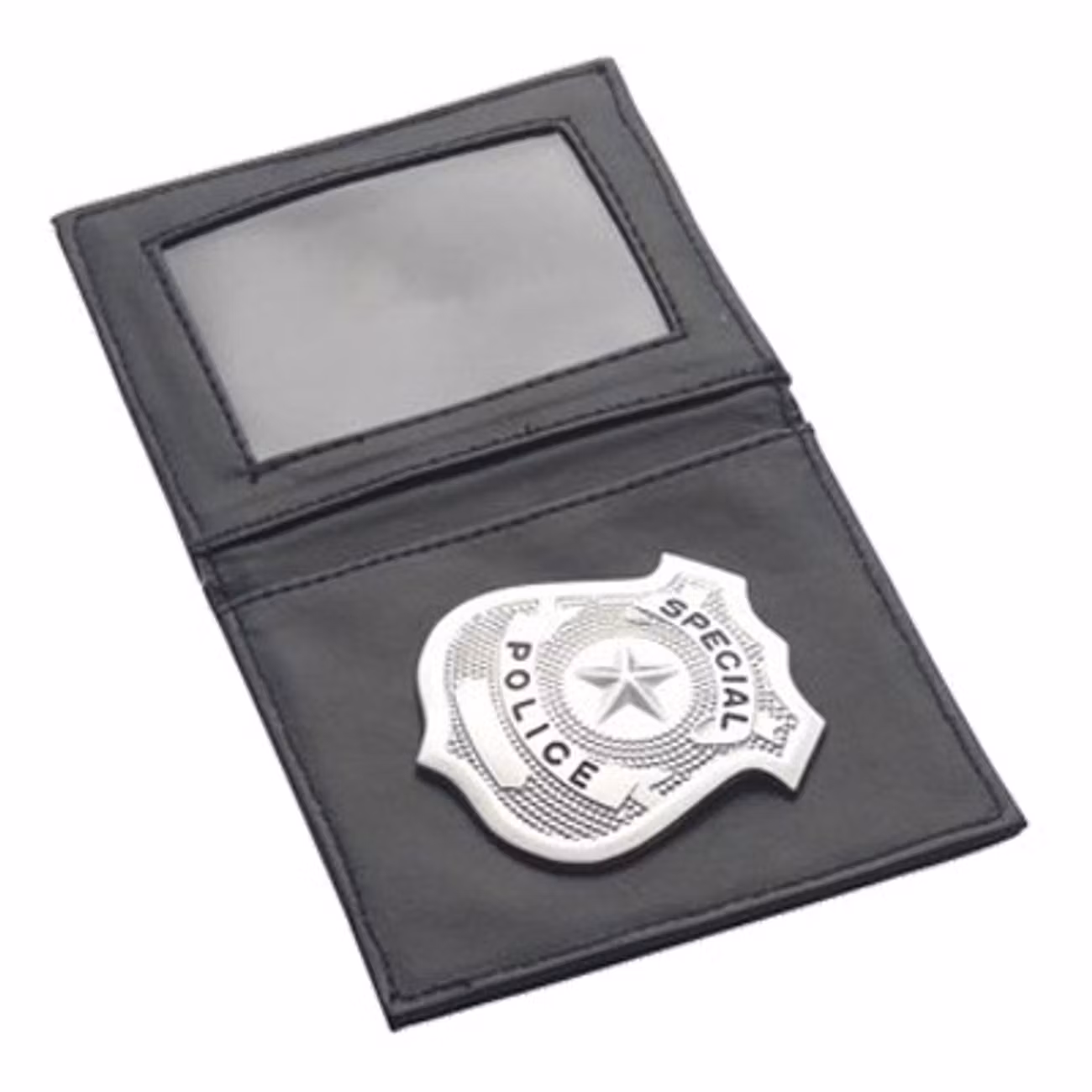 Plånbok Med Polisbricka är en svart plånbok med polisbricka i metall med texten "Special police". Plånboken mäter 7,5 cm på höjden är 5,1 cm bred.