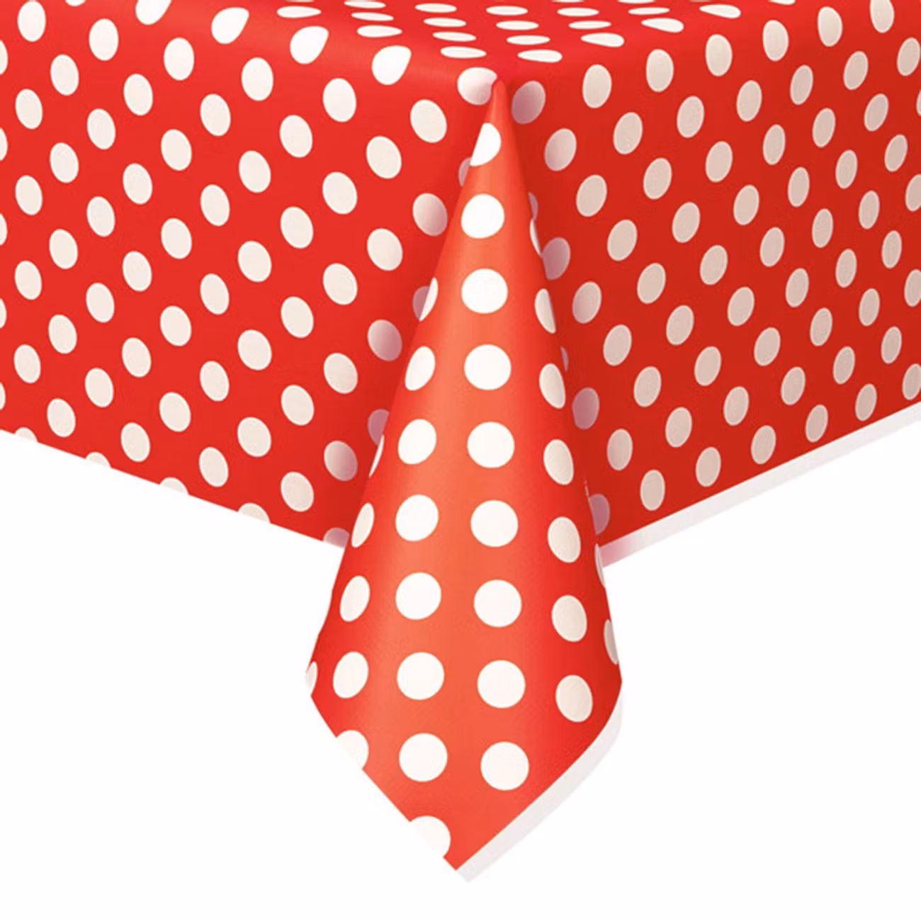 Plastduk Röd/Vit Prickig mäter 137 x 274 cm stor.