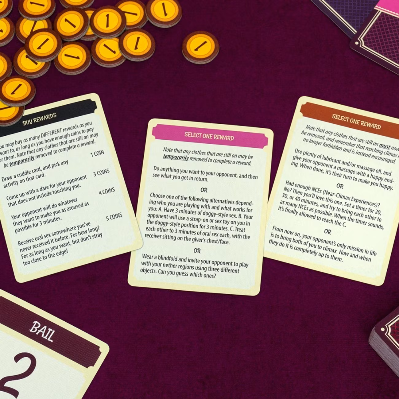 - Innehåll: 1 Spelbräde, 2 Spelpjäser, 20 Mynt, 54 Spelkort, 62 Belöningskort med 211 sexiga utmaningar, 2 Fega ur-kort, 2 Handrankingskort och 1 Regelhäfte.