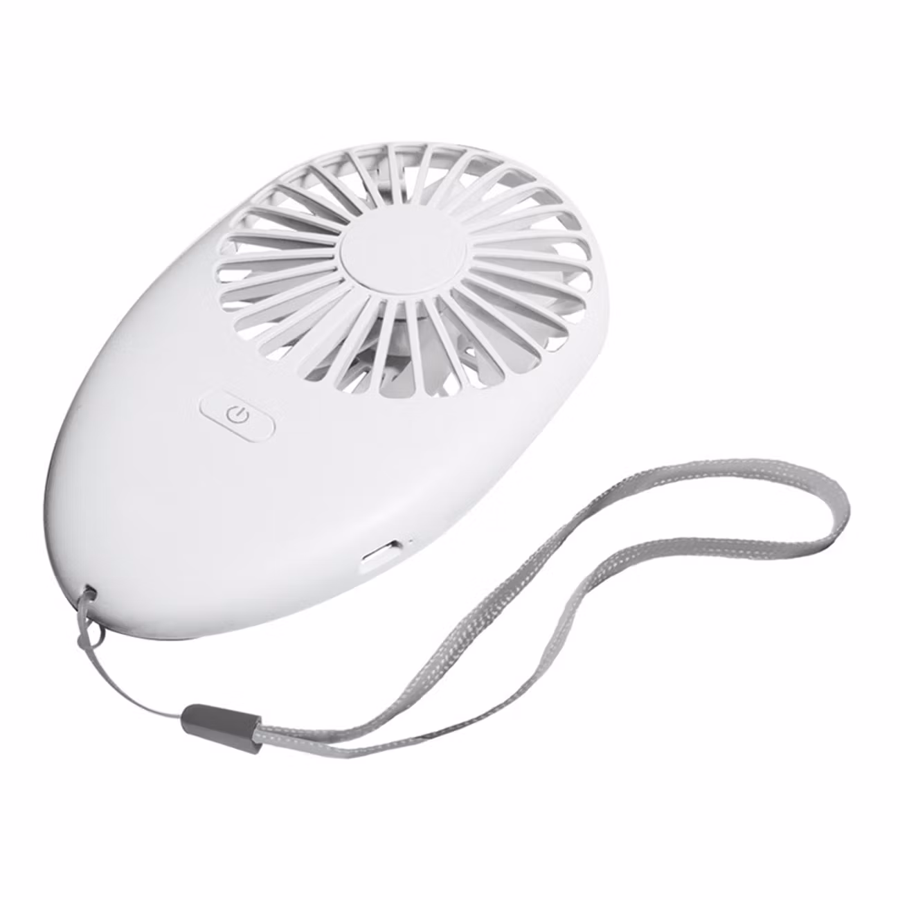 Portabel Handfläkt är enkelt att bära med sig och ett smidigt band ingår. Fläkten har två nivåer. Ett litiumbatteri ingår liksom en USB-sladd för laddning.