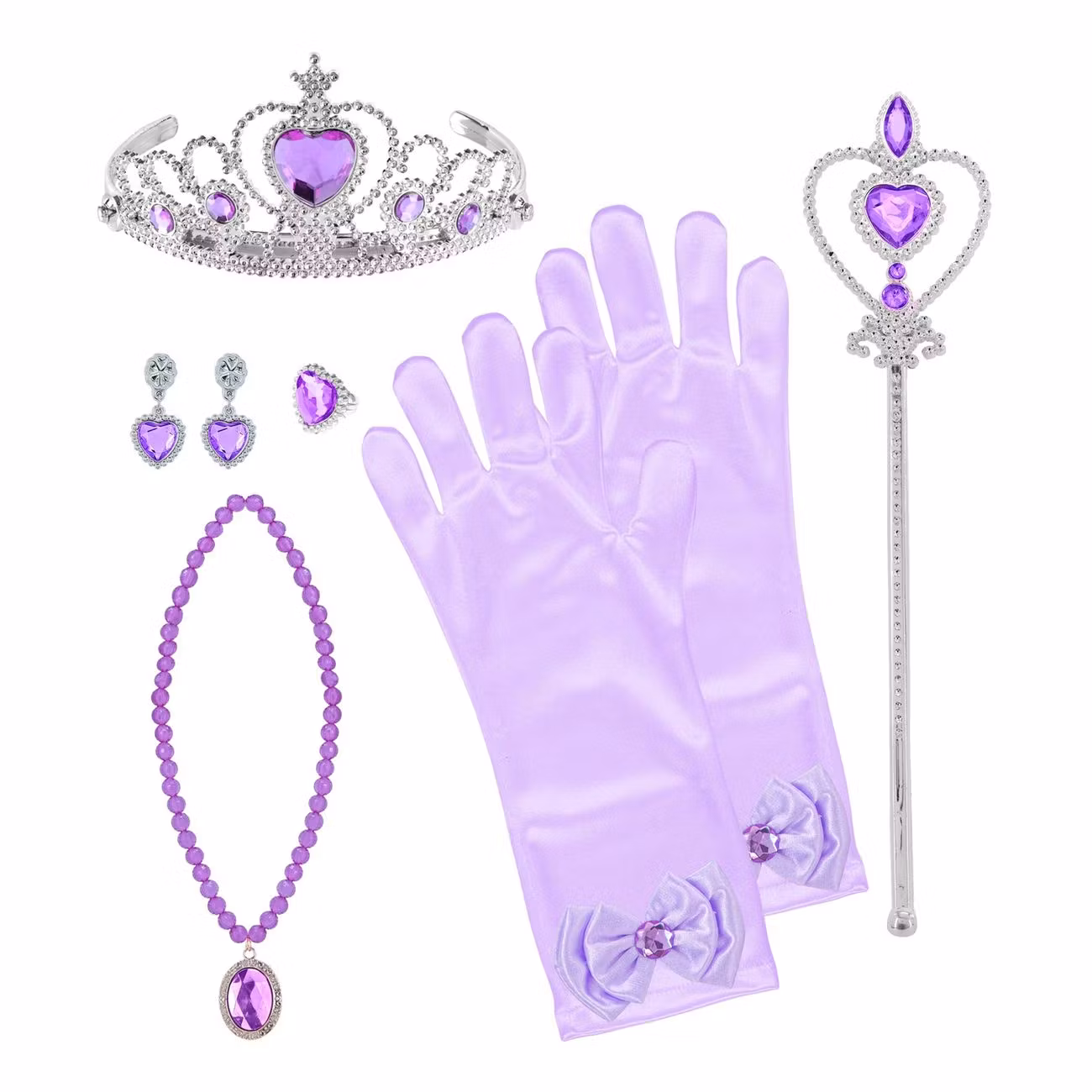 Prinsessa Tillbehörskit Lila för Barn inkluderar ett par lila satinhandskar, en spira, en silvrig tiara med lila stenar samt halsband, ring och örhängen. Perfekt till leklådan hemma eller till prinsess-kalaset!