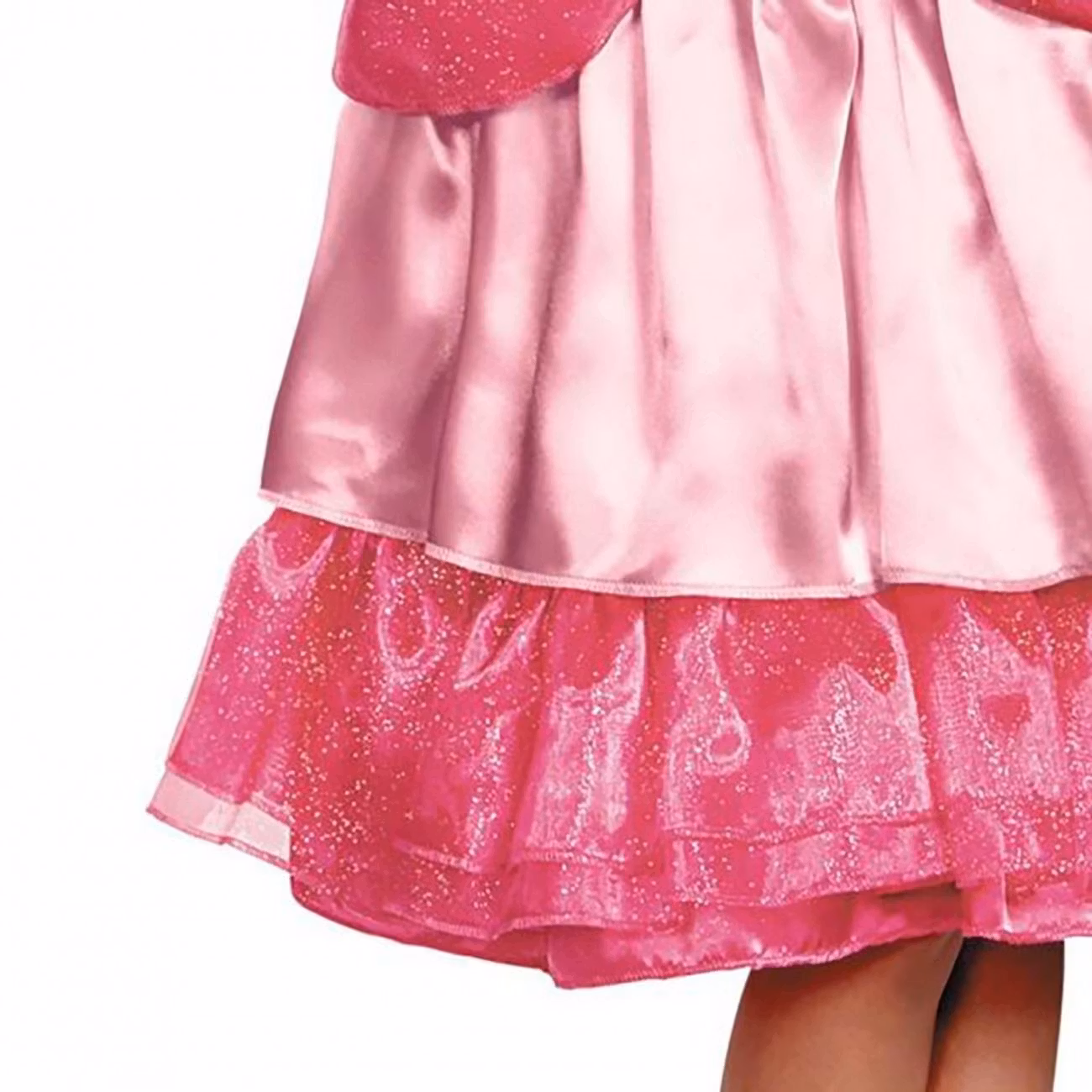 Prinsessan Peach Deluxe Maskeraddräkt innehåller en rosa klänning i polyester samt en guldig prinsesskrona. Observera att skor och handskar ej medföljer.