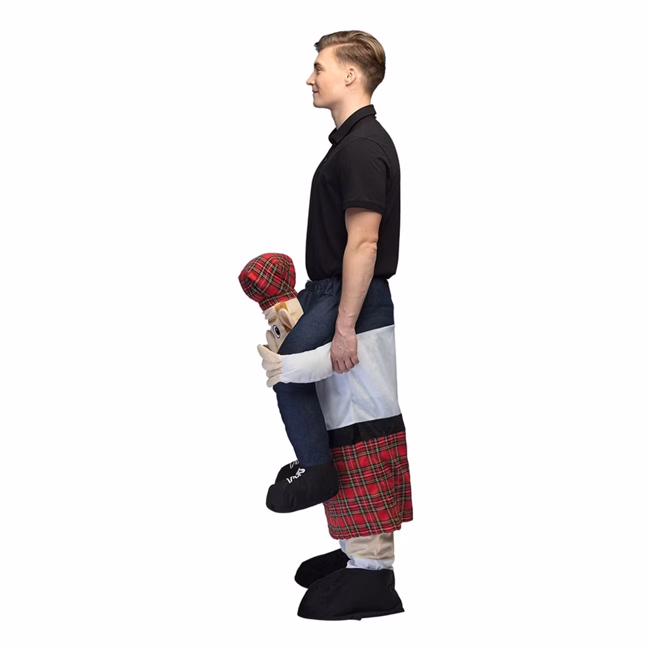 Ridande Skotte Maskeraddräkt är en rolig dräkt som består av en nederdel i form av en "skotte" som ser ut att bära runt på dig när du går. Skotten bär kilt, en liten väska och har en matchande skotsrutig hatt på huvudet. Dräkten sitter bekvämt runt midjan med hjälp av elastisk resår.