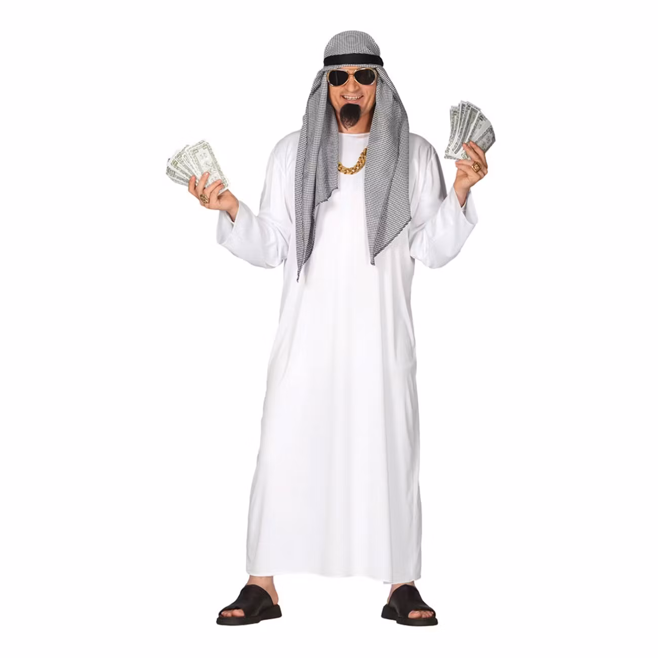 Rik Shejk Maskeraddräkt är en maskeraddräkt som efterliknar en Shejk. En vit lång tunika, en gråaktig ghutra med svart band och en sjalett medföljer. Allt du behöver för att vara den ekonomiskt oberoende shejk du alltid drömt om att vara.