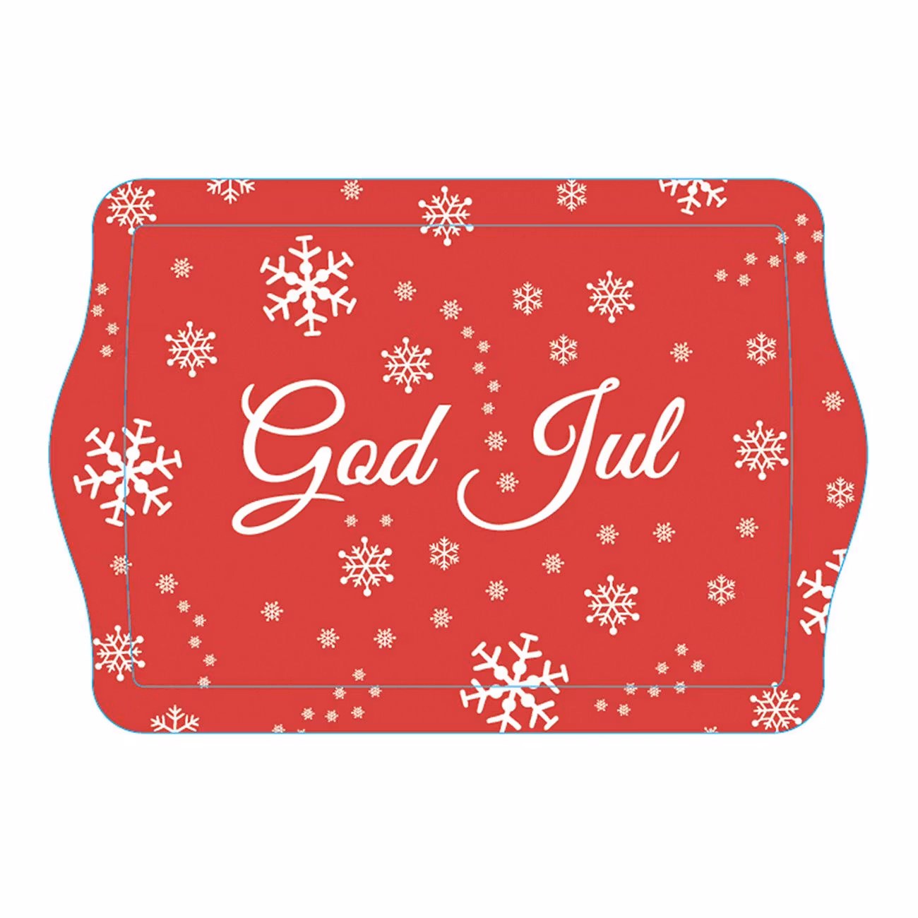 Röd Bricka God Jul är en röd rektangulär bricka dekorerad med vita snöflingor i olika storlekar och former. På brickan står det också "God Jul" med vita bokstäver. Brickan finns i två storlekar, välj om du vill ha den mindre eller den större.