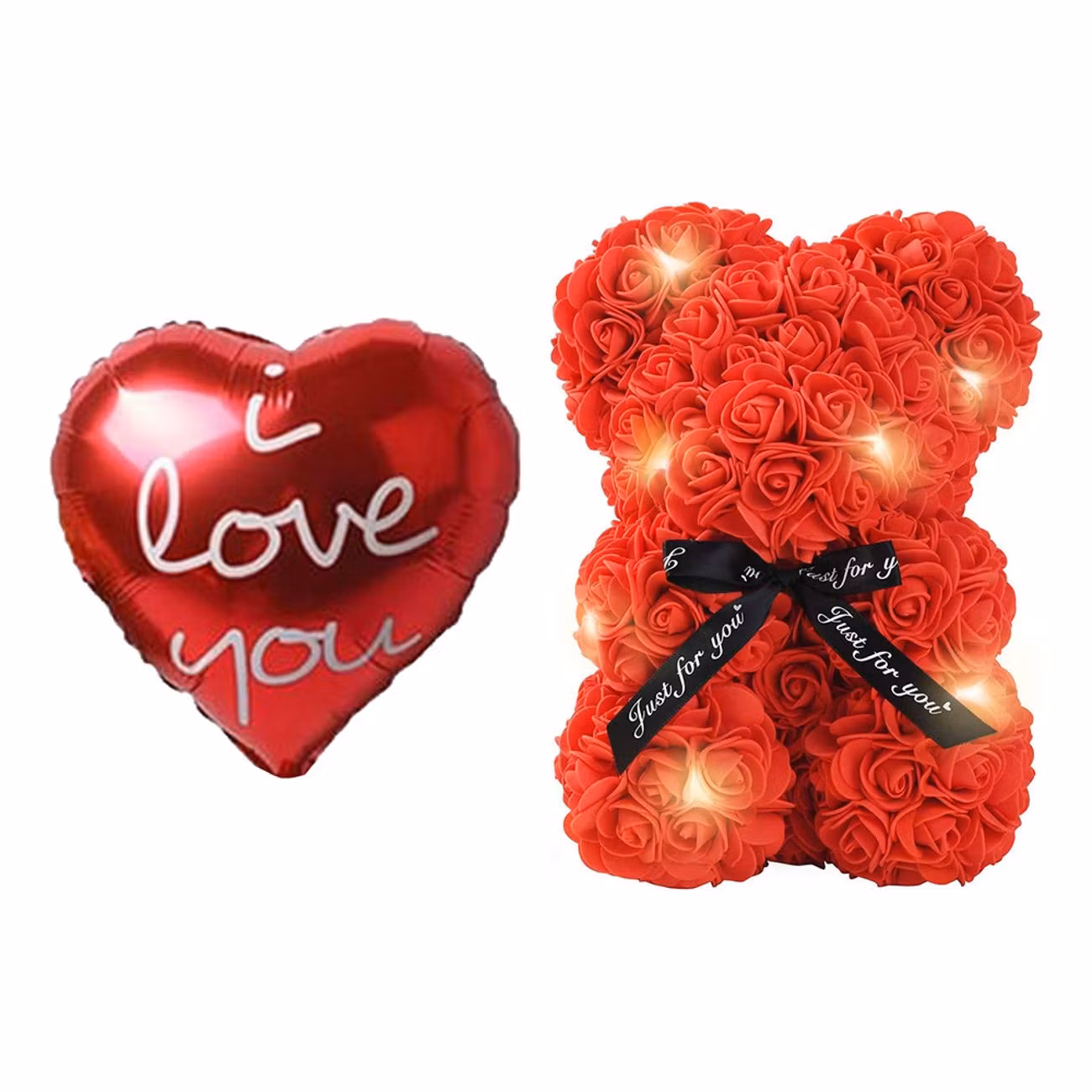 Rosbjörn LED Presentkit är en vacker liten kärleksbjörn som kommer dekorerad med röda rosor, samt ett svart sidenband knutet som en rosett runt halsen med texten: "Just for you". Kärleksnallen är inlindad i en LED-slinga (batterier medföljer ej) och leveras i en superfin presentlåda. Medföljer gör även en gullig liten hjärtballong med texten "I love you".