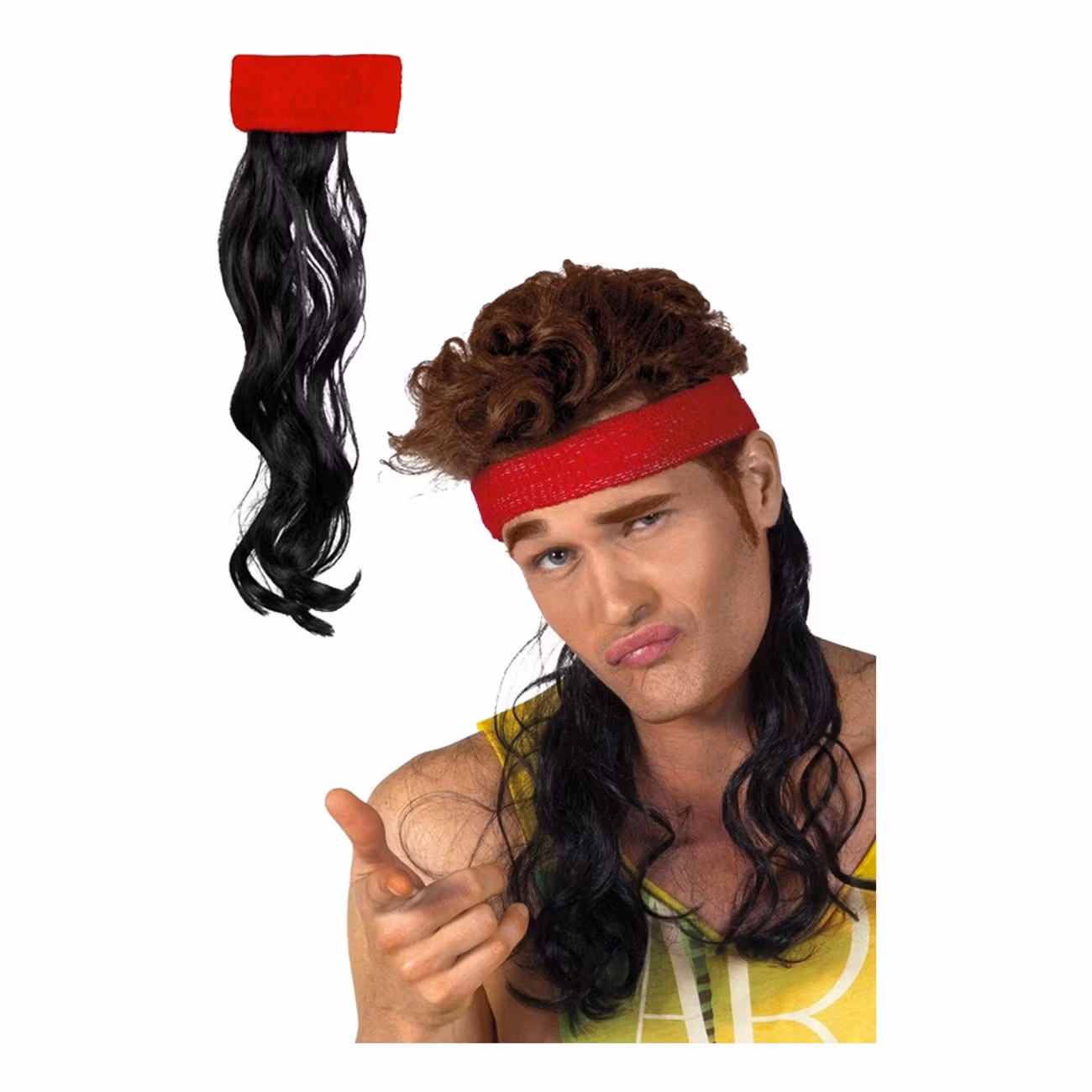 Rött Pannband med Svart Hår består av ett rött elastiskt hårband som har svart långt och lockigt hår fastsytt på baksidan lägger sig perfekt på axlarna. Perfekt alternativ till en peruk till maskeradfesten!