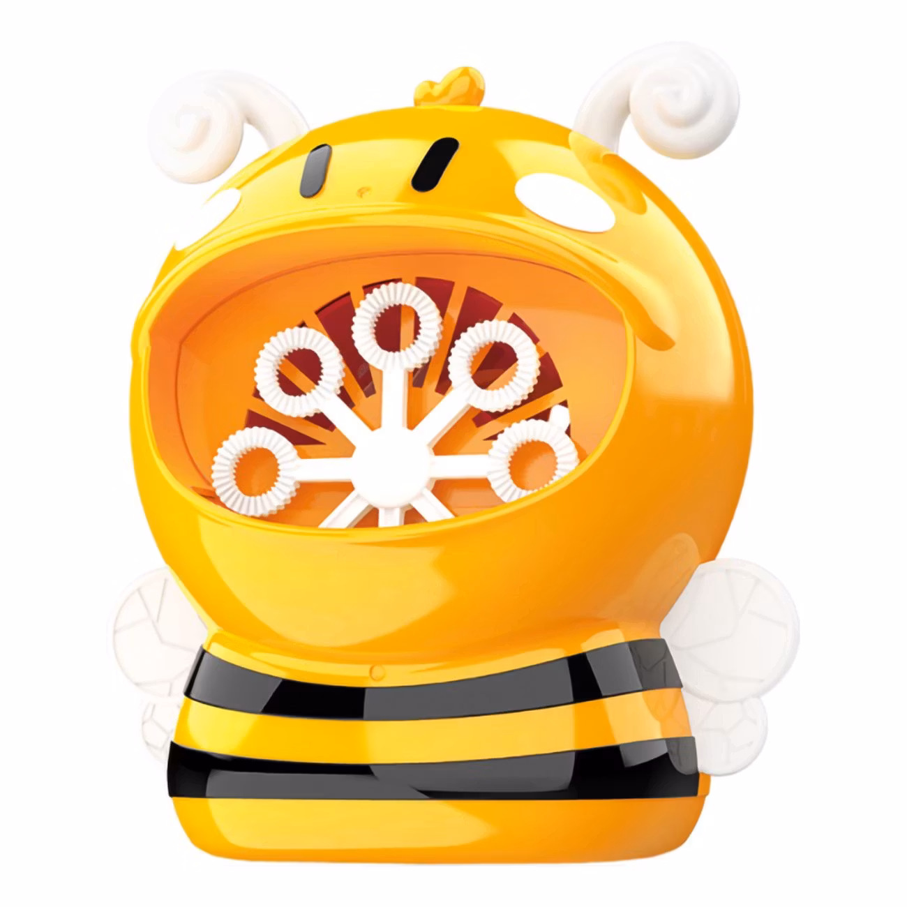 Såpbubbelmaskin Bi är en söt såpbubbelmaskin som ger glädje till varje födelsedag eller fest! Fyll bara bubbelvätskan i behållaren och tryck på "Start" för att aktivera de roterande bubbelstavarna, en fläkt kommer då blåsa bubblor non-stop! Lämplig för inomhus- eller utomhusbruk.