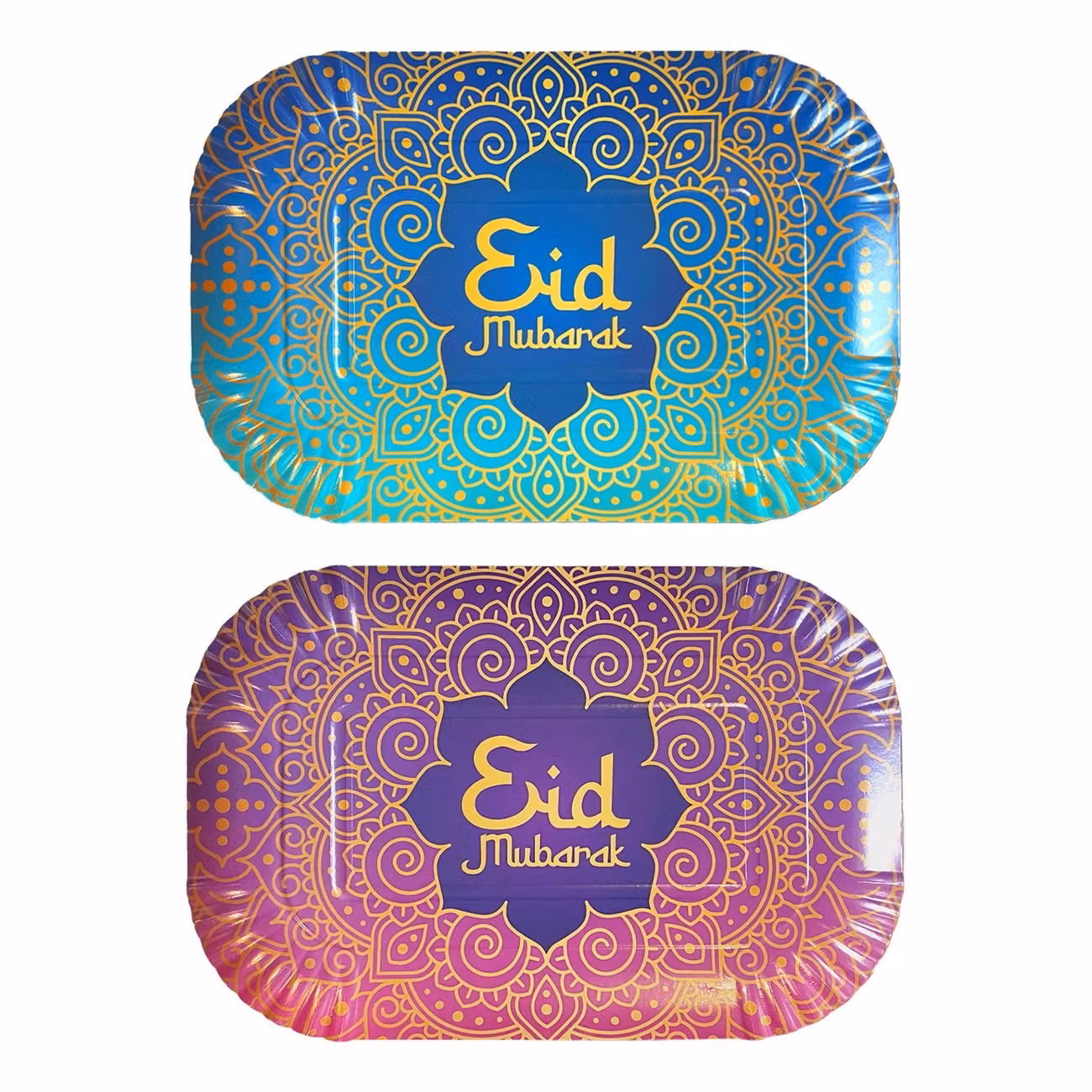 Serveringsbrickor Eid Mubarak inkluderar två stycken papperstallrikar som kommer med ett elegant guldmotiv och texten "Eid Mubarak". Tallrikarna kommer i två olika bakgrundsfärger, blå och turkos samt lila & rosa.