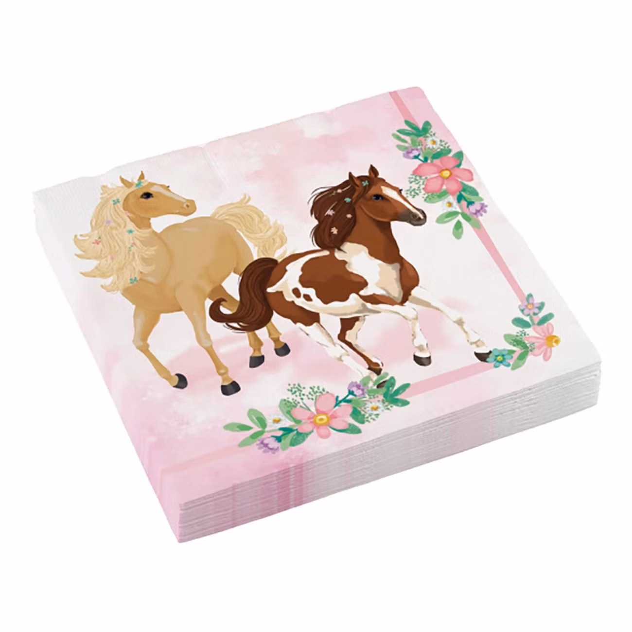 Servetter Hästar inkluderar 20 rosa servetter med hästmotiv. På servetterna finns även en kant med vackra blommor i olika färger. Servetterna blir ett både dekorativt och praktiskt inslag på det dukade bordet.