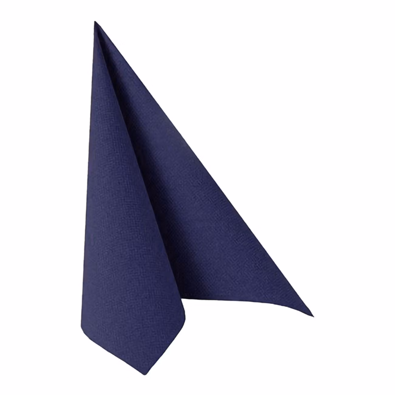 Servetter Royal Mörkblå kommer i en förpackning med 20 stycken servetter i premiumkvalité. De har en mjuk linnekänsla och en hög absorptionsförmåga. Servetternas mått är 40 x 40 cm när de är utvikta och 20 x 20 cm outvikta. De är 1/4-vikta. Servetterna är Svanenmärkta och FSC-certifierade.