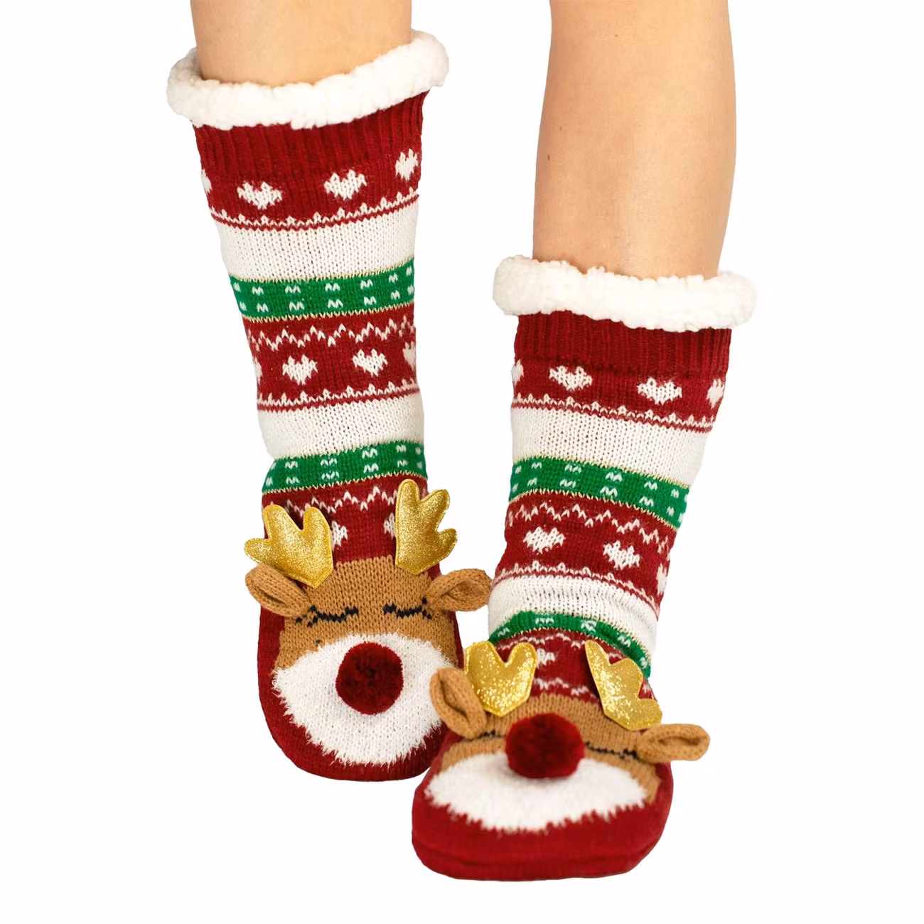 Sherpastrumpor Julren är ett par varma och supermjuka långa strumpor i en rolig och julig design av en ren med små guldfärgade horn, öron och en röd nos. En räddare i nöden för alla som har frusna, kalla fötter - klockren som julklapp!