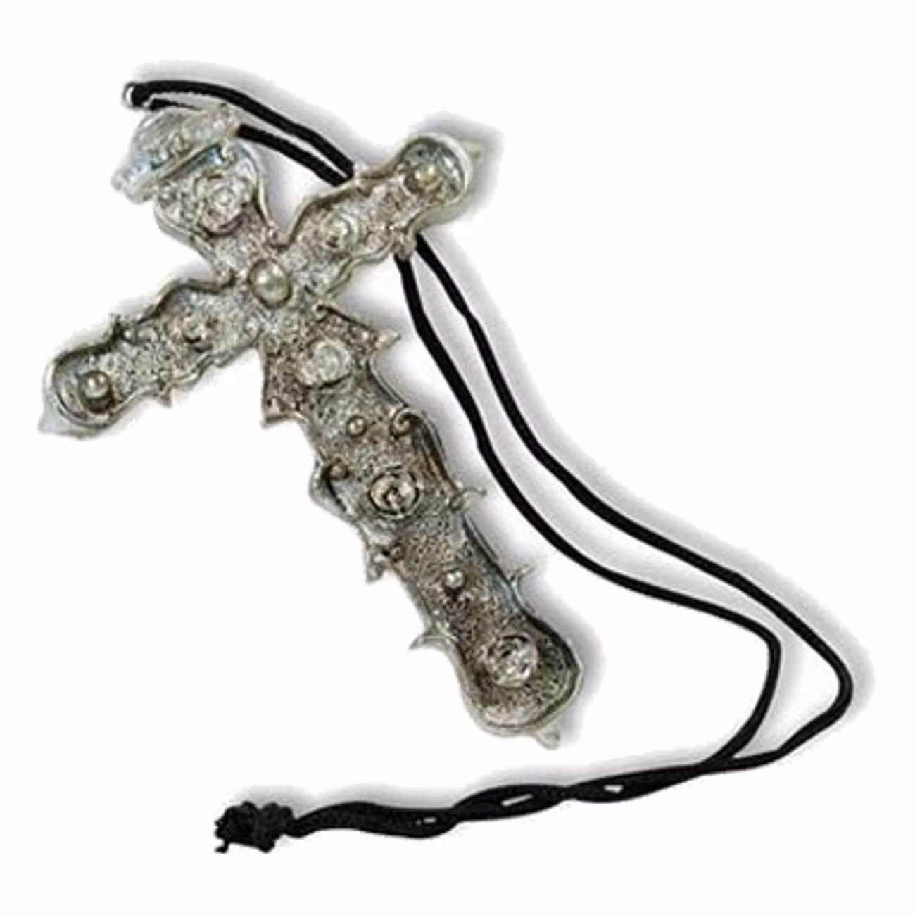 Silverfärgat ornament kors med svart snöre att hänga runt halsen.