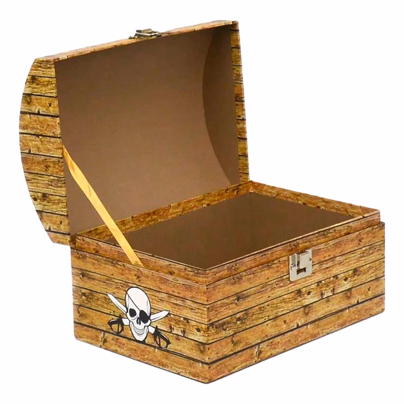 Klart det blir skattjakt på kalaset! Fyll den här kistan med mängder av chokladpengar och annat smaskigt som barnen kan tänkas önska och göm den där de sist kan tänkas leta. En garanterad succé på barnkalaset med pirattema!