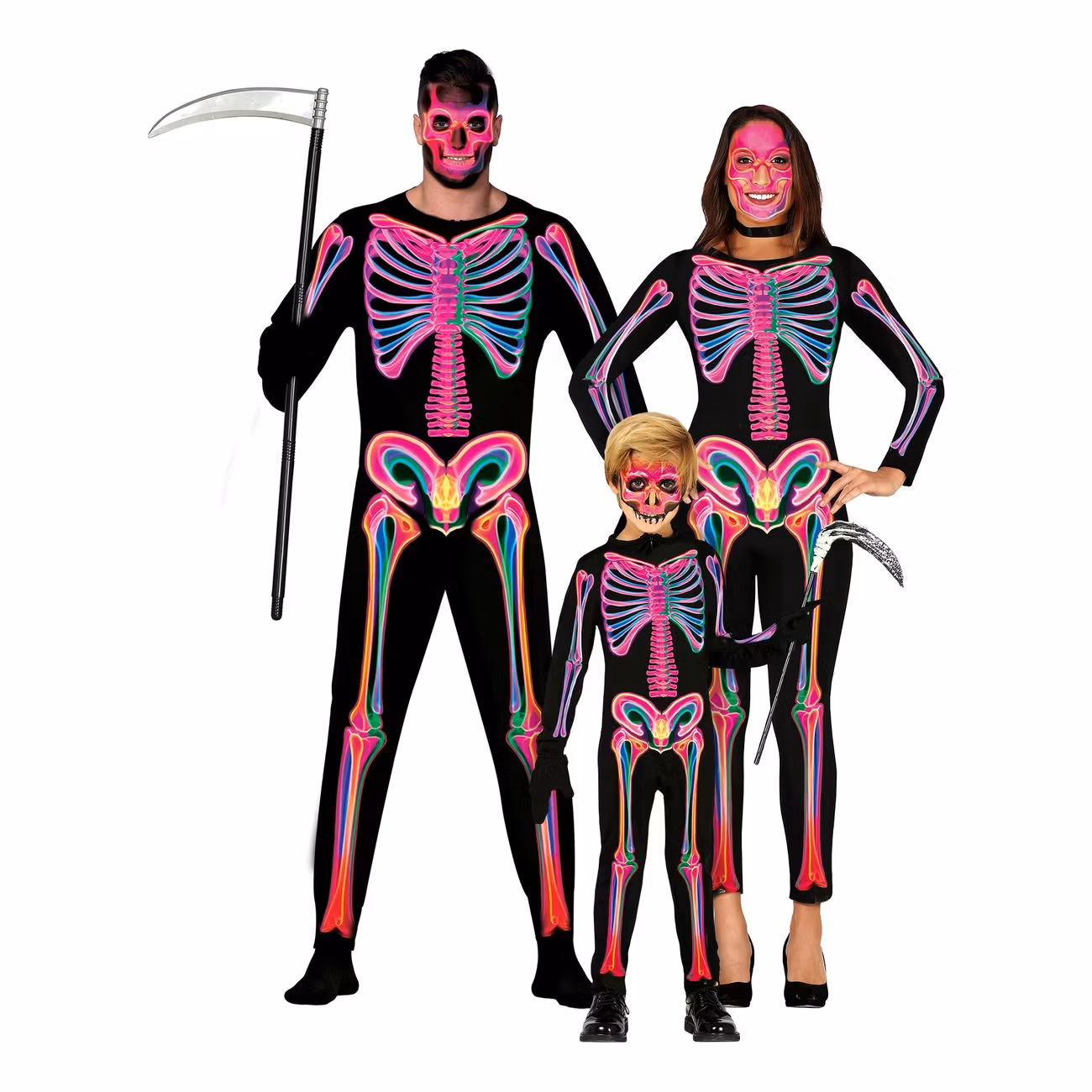 Varför smälta in på festen som ett alldagligt benrangel när du kan lysa upp som ett neonfärgat skelett? Här snackar vi partyglöd på högsta nivå – denna galet häftiga UV-reaktiva skelettdräkt kommer imponera deluxe kan vi lova! En klockren skrud för halloweenfesten eller UV-festen.