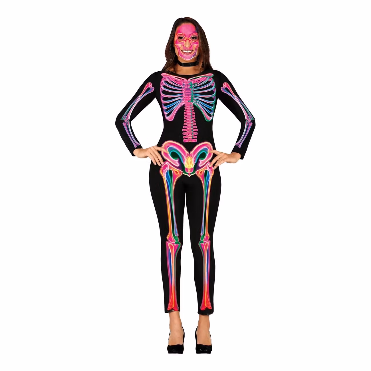 Skelett Neon Dam Maskeraddräkt inkluderar en svart jumpsuit med neonfärgat skelettmotiv på framsidan som lyser i UV-ljus. Perfekt dräkt till Halloween eller UV-partyt! Köp till halloweensmink och tillbehör för att få en fulländad look.