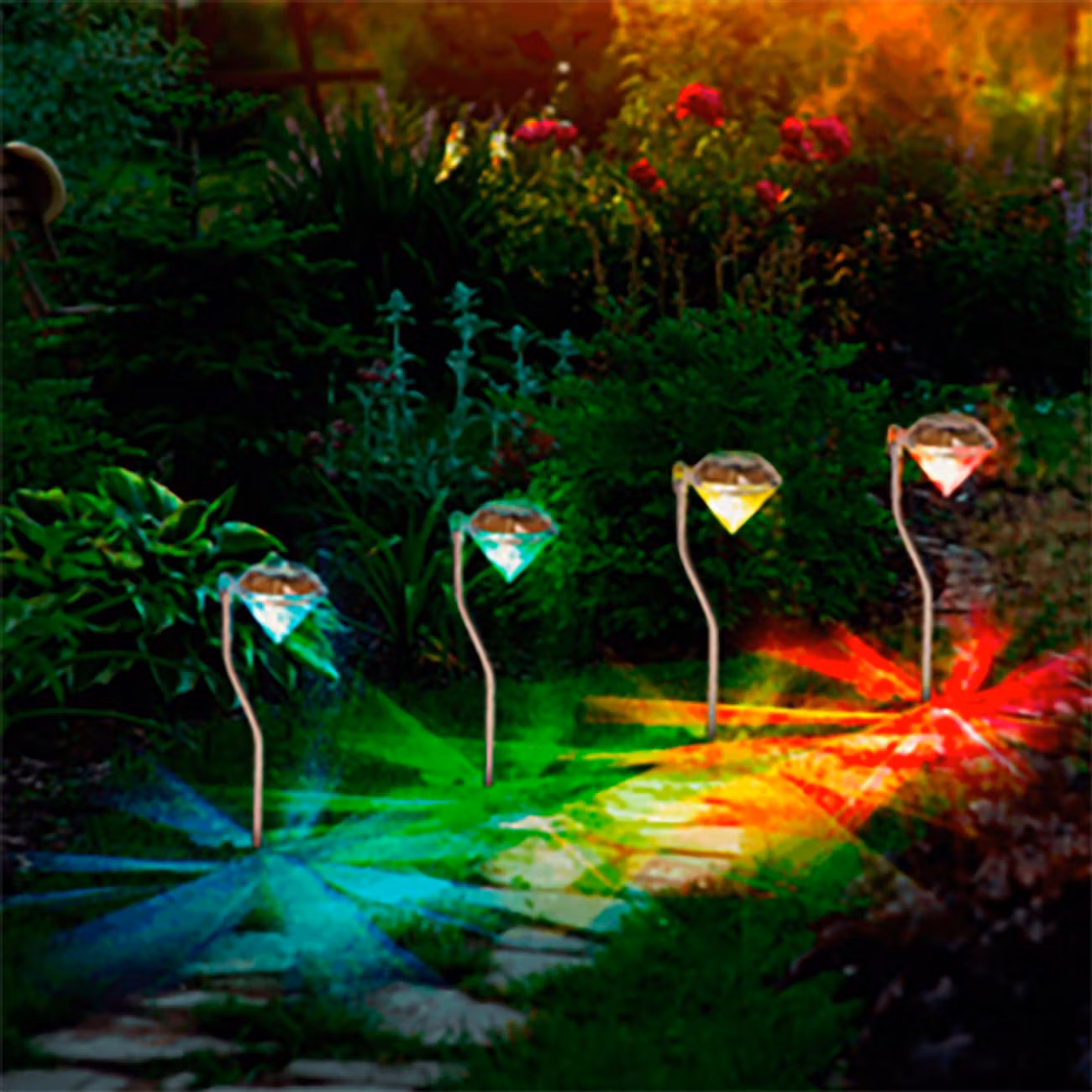 Solcellslampor Diamant Färgskiftande inkluderar fyra LED-lampor som är solcellsdrivna och lyser i färgerna blått, rött, grönt och gult. Lamporna sticker du enkelt ner i gräsmattan, i en rabatt eller i en kruka.