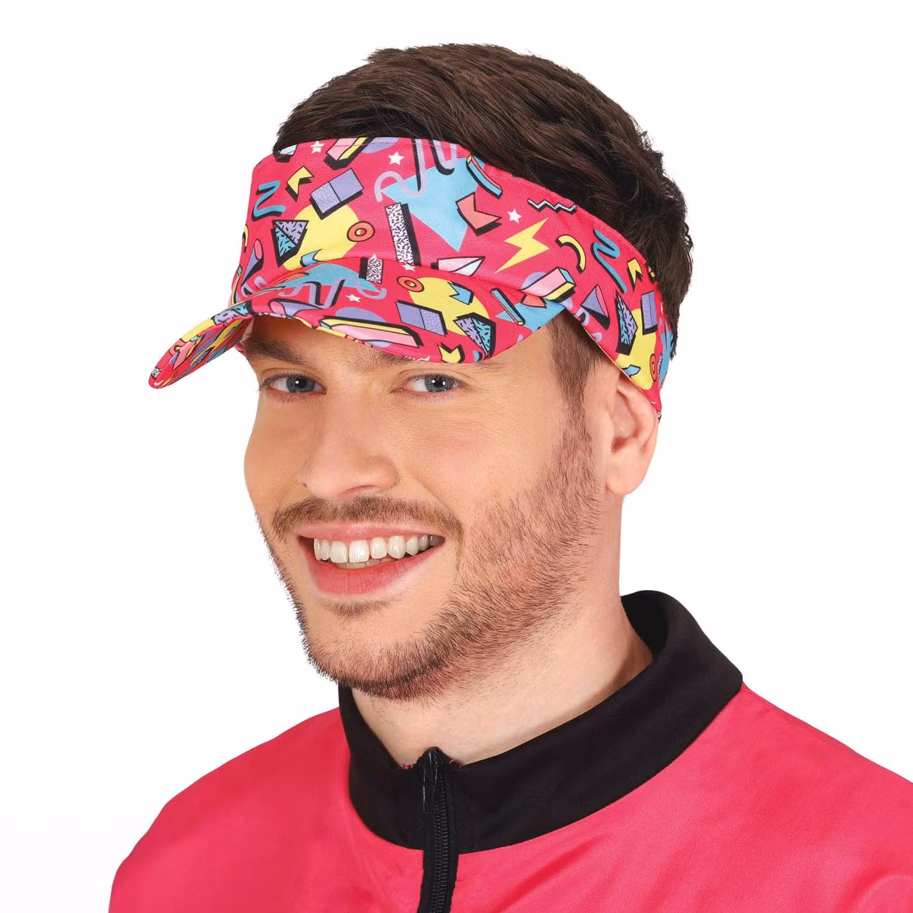 Solskärm 80-tal Rosa är en rosa solskärm med geometriska former i olika neonfärger. Resårband finns baktill för bästa passform. Perfekt huvudbonad för temafesten, svensexan eller möhippan!
