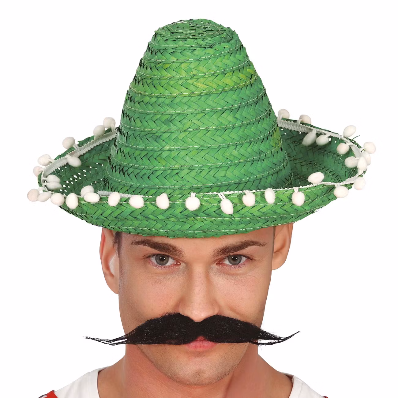 Sombrero Liten Grön är en klassisk sombrerohatt i litet format med vita små mjuka bollar längs kanten och flerfärgat snöre.