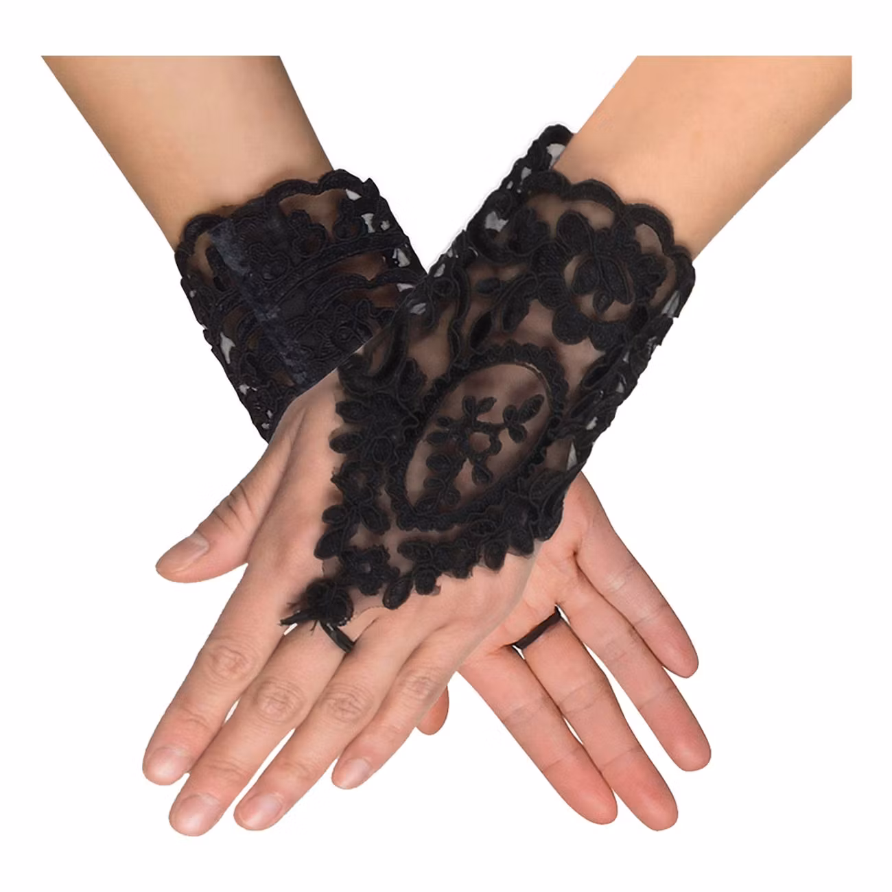 Spetshandskar Svart inkluderar två stycken svarta fingerlösa handskar i spets som täcker handryggen och handleden. Handskarna är tillverkade i polyester och finns i en storlek som passar vuxna.