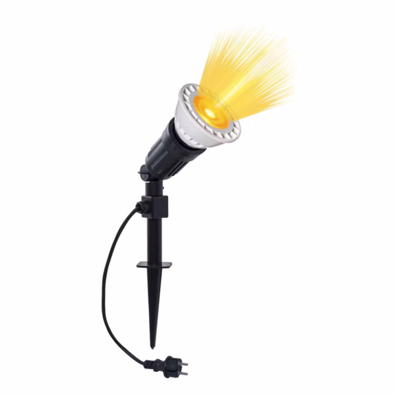 Markspjut som enkelt fästs i marken för att lysa upp buskar och träd i trädgården. Med E27-sockel och PAR38 ljuskälla, samt en 5 meter lång gummikabel. Ljuskälla säljs separat. Vi rekommenderar E27 Utomhuslampa med Fjärrkontroll.