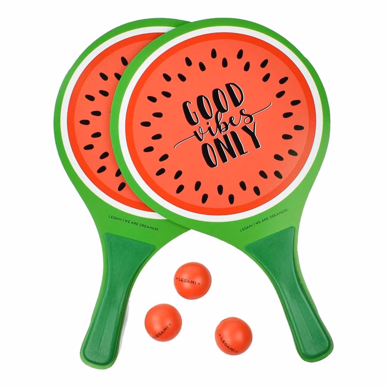 Strandspel Watermelon inkluderar två racket och tre bollar samt ett fodral. Färgen är röd och grön och ser ut som en vattenmelon. På båda racket står det "Good vibes only".