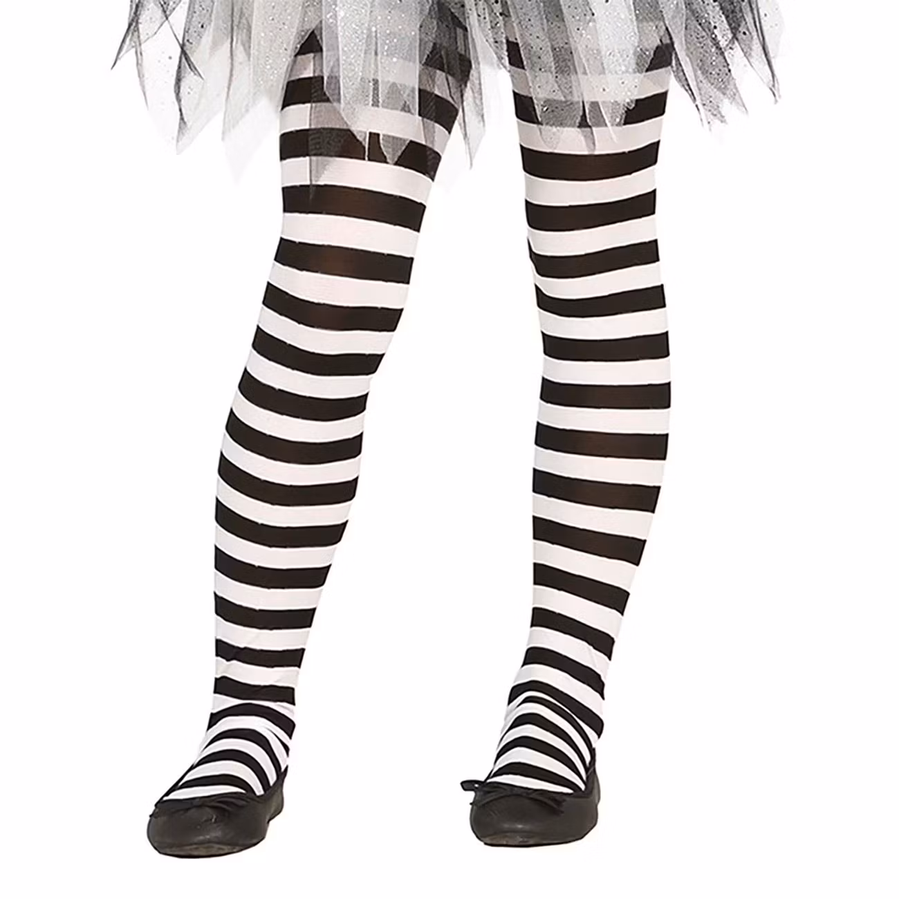 Strumpbyxor för Barn Svart/Vita Randiga är randiga strumpbyxor som kommer i en stretchig modell som passar barn mellan åldrarna sju till tolv. Perfekt till Halloween när barnet skall klä ut sig till exempelvis en häxa eller liknande!