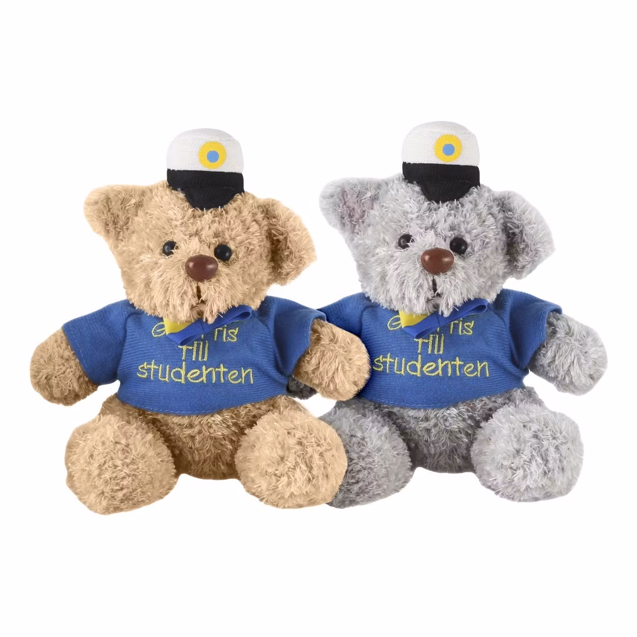 Mjuk och finklädd nallebjörn med studentmössa, tröja och allt färdig att ges bort som studentpresent. Nallen har en blågul liten fluga och en blå tröja med texten "Grattis till studenten".