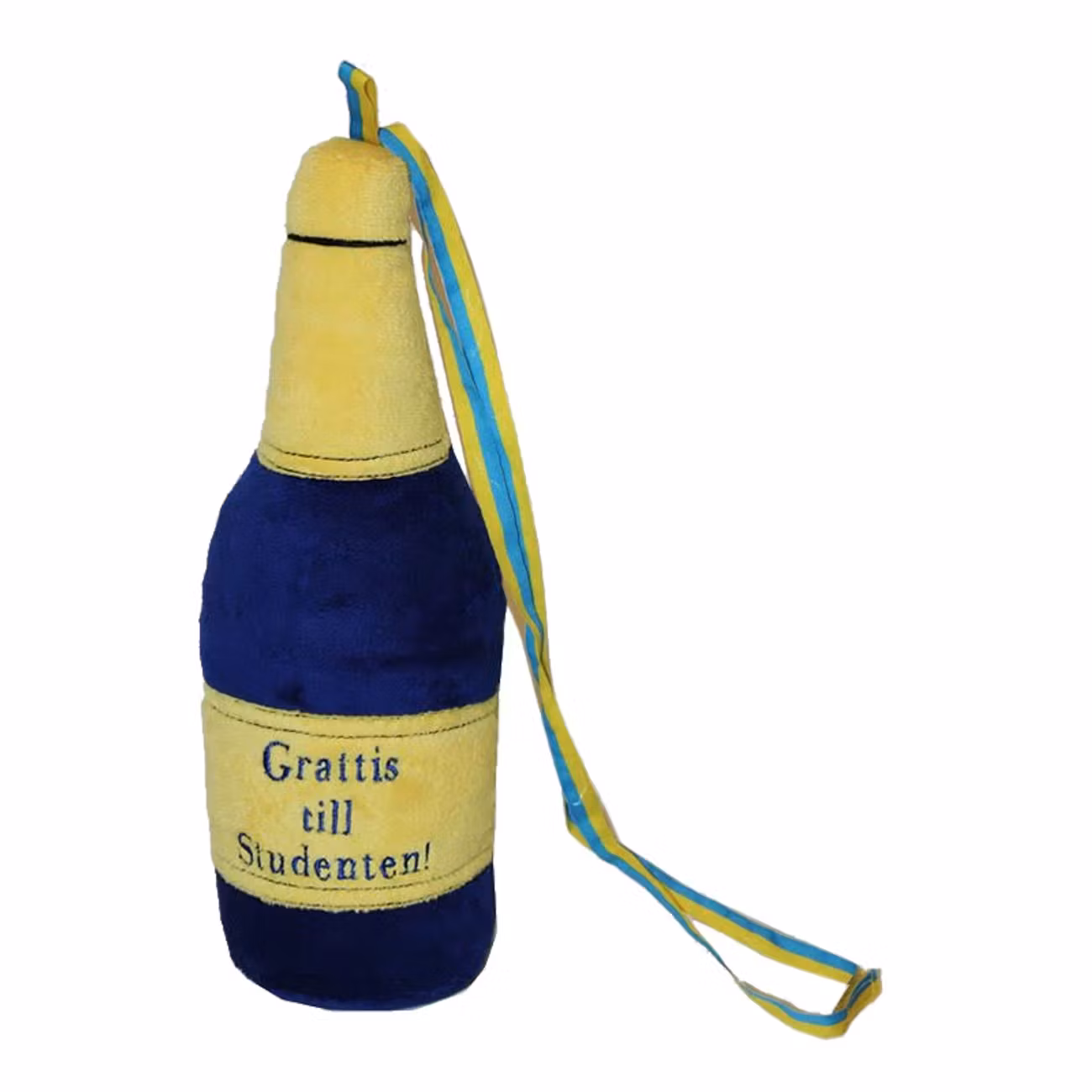 Vilken tur att du kan välja den här mjuka och lätta champagneflaskan att hänga runt halsen på den som tar studenten, så slipper den nyutexaminerade gå runt med en tung flaska runt halsen vars band skär in i nacken och sedan får dricka ljummen champagne. Då är det bättre att ge en aningen lättare symbol, och så kan en kyld flaska ges vid ett senare tillfälle. Det är inte bara roligt av dig att ge denna studentflaska istället, det är även väldigt omtänksamt av dig. Flaskan är i mjukt tyg i blått och gult, och på flaskans etikett står ”Grattis till Studenten”.