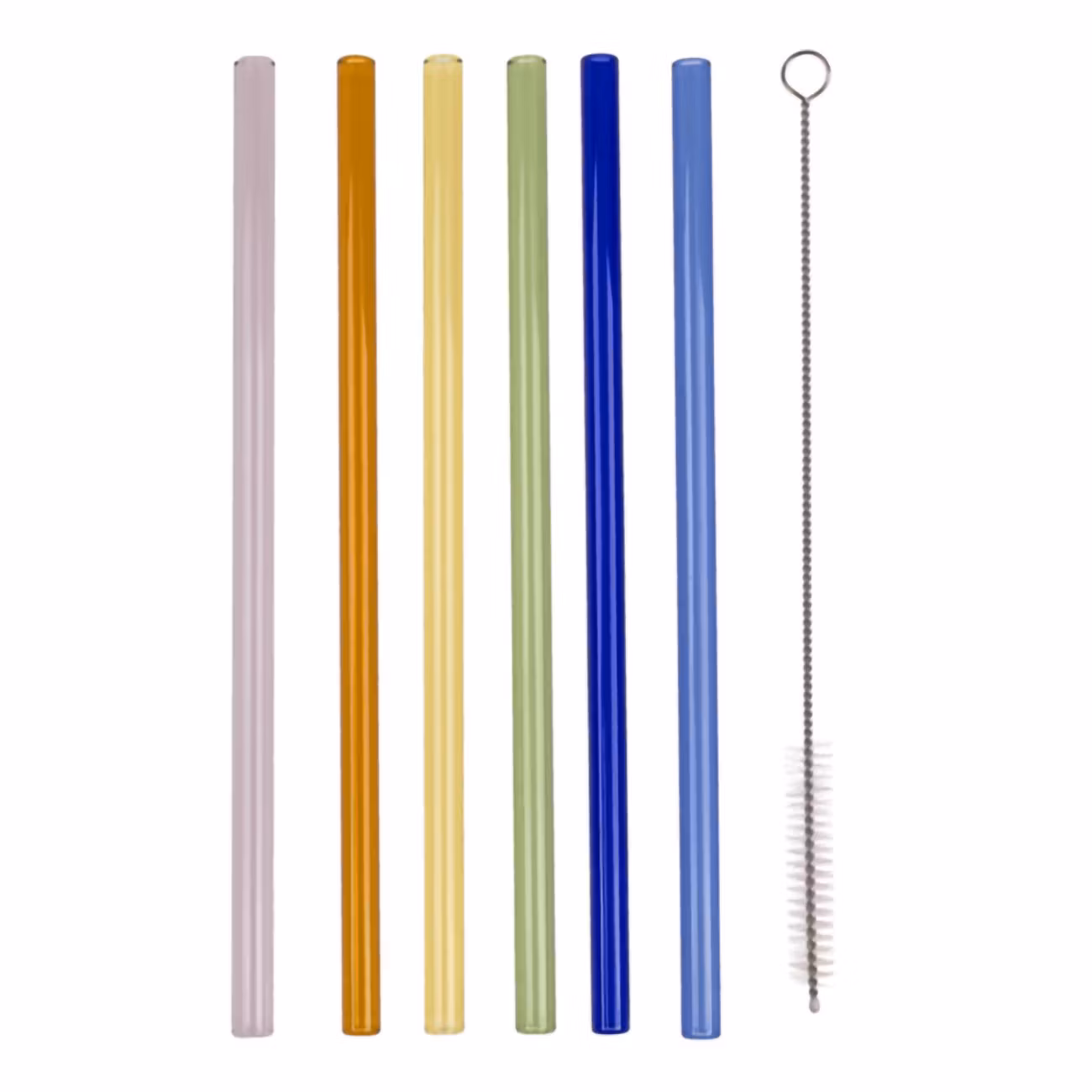 Sugrör i Glas Färgmix med Borste kommer med 6 stycken raka sugrör i glas i olika färger. Det ingår även en piprensare för rengöring. Trevligt och miljövänligt.