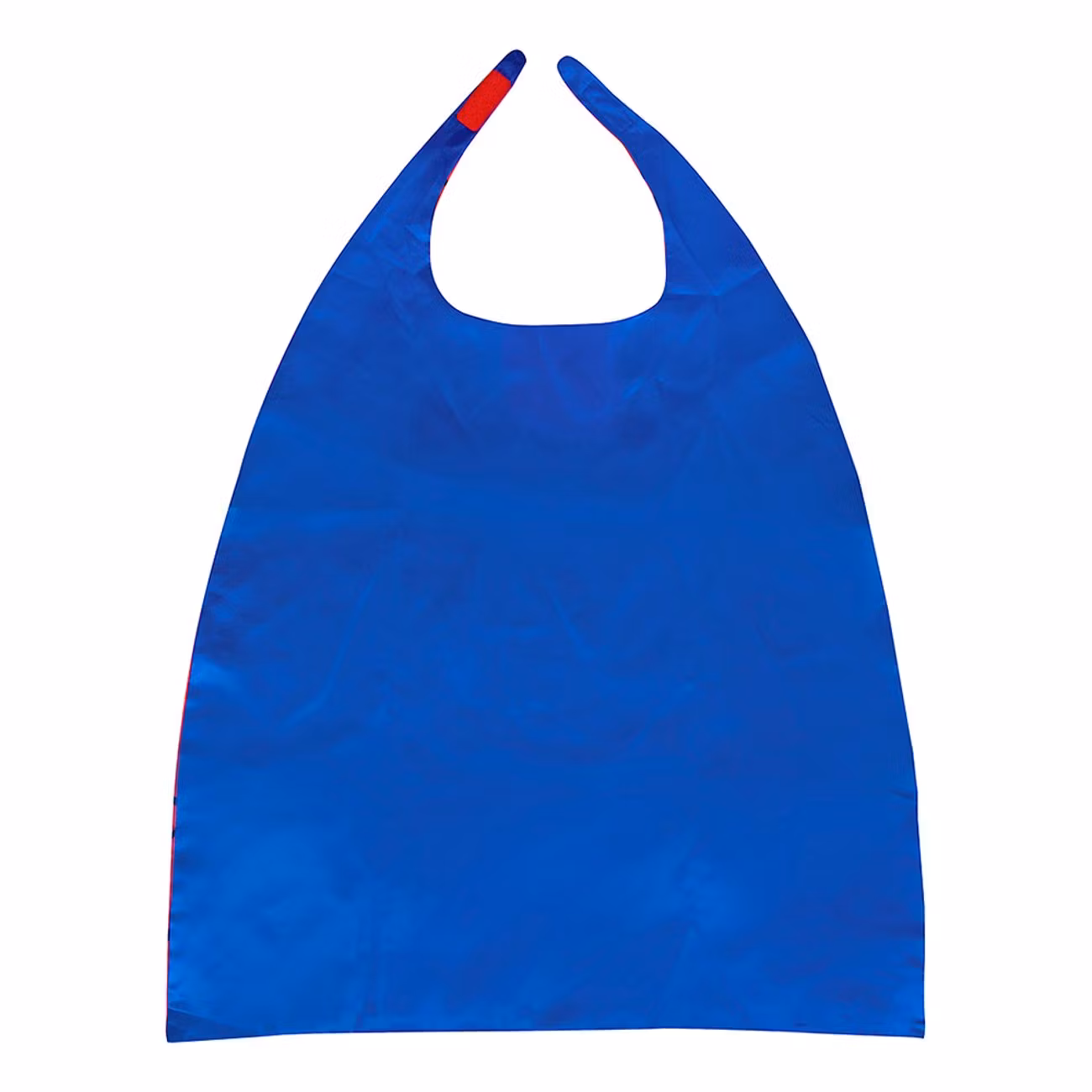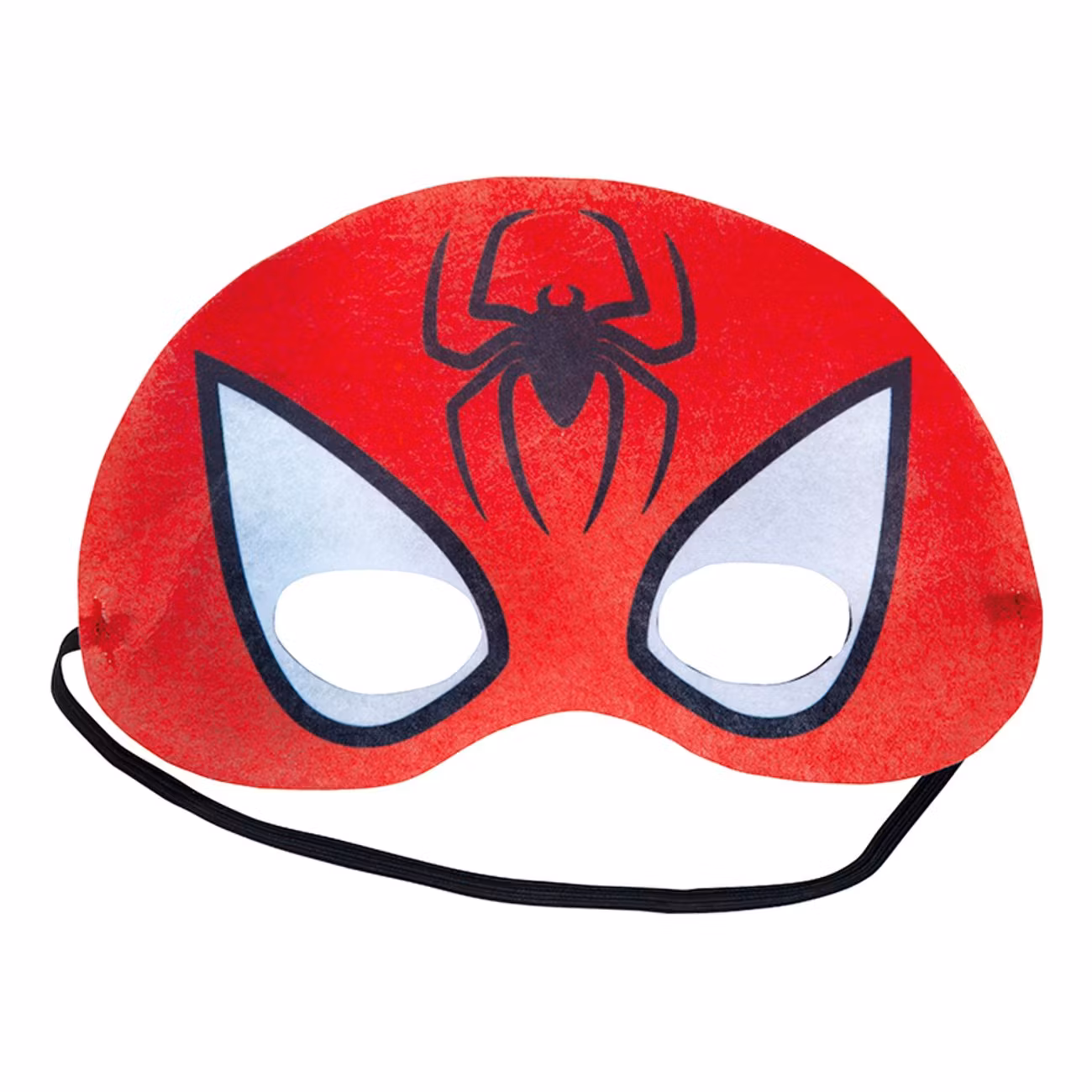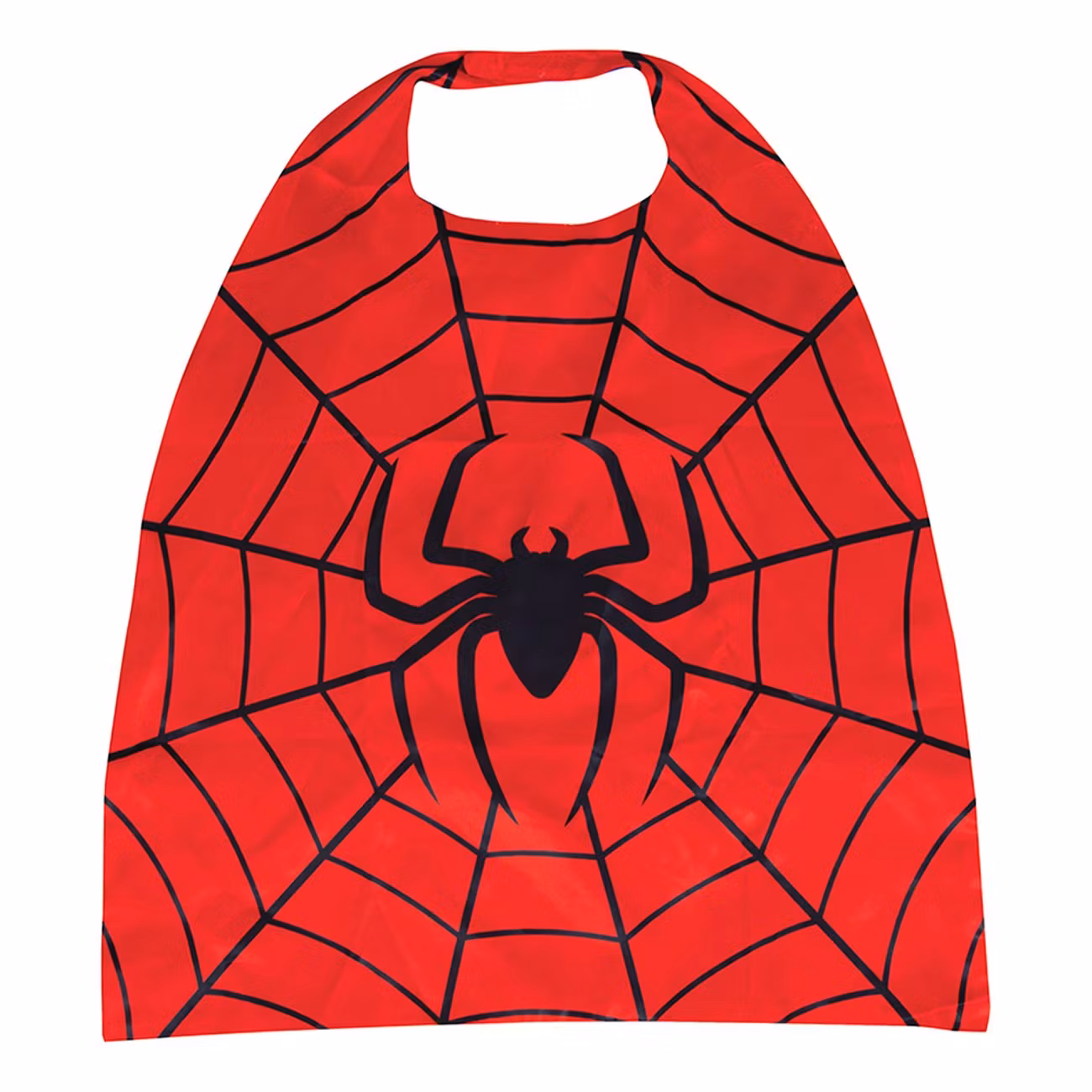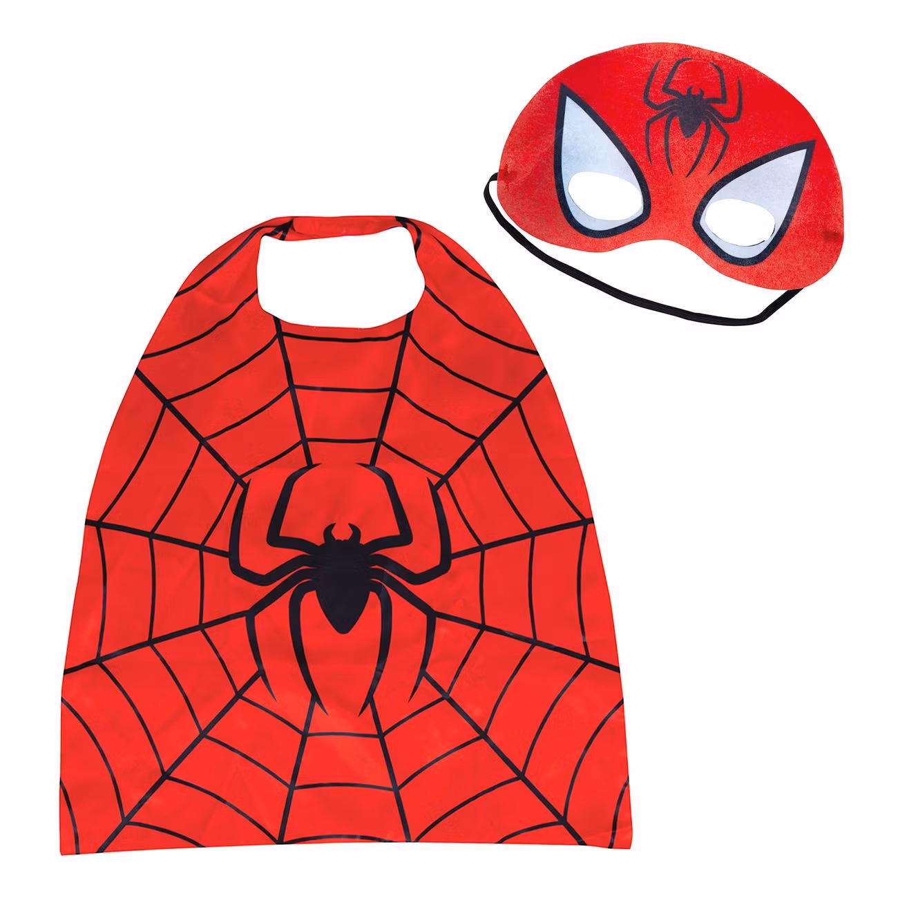 Superspindel Tillbehörskit för Barn inkluderar en röd mantel tryckt med svart spindelnät och en spindel på rygge samt en matchande röd ögonmask med spindel. Manteln har blått innertyg och fästs med kardborre runt halsen. Ögonmasken sitter bekvämt runt huvudet med resårband.