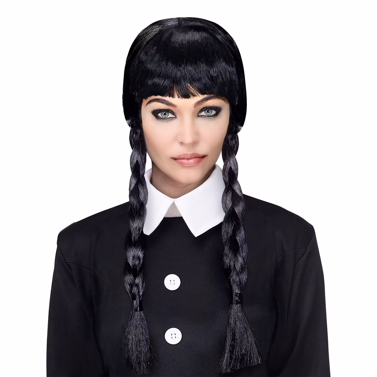 Spöktjej Svart Peruk med Flätor är en svart peruk med långa flätor och svarta rosetter. Perfekt om du ska efterlikna Wednesday från familjen Addams eller någon annan karaktär som har långa svarta flätor på maskeraden.