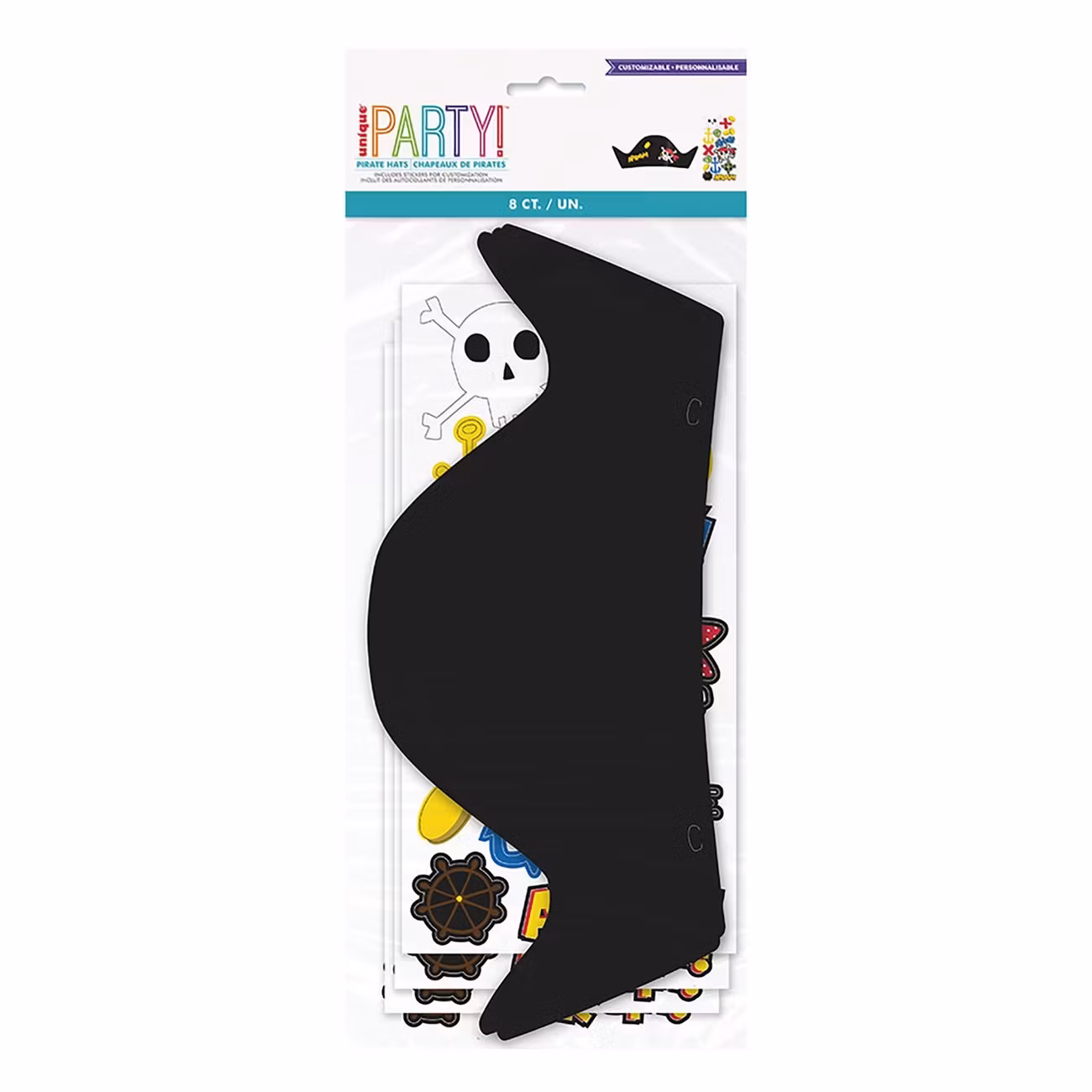 Svarta Pirathattar i Papp inkluderar åtta stycken svarta pirathattar i papp som kommer i en storlek som passar barn. Medföljer gör även fyra stycken dekalark med klistermärken som låter dig fritt dekorera hattarna-