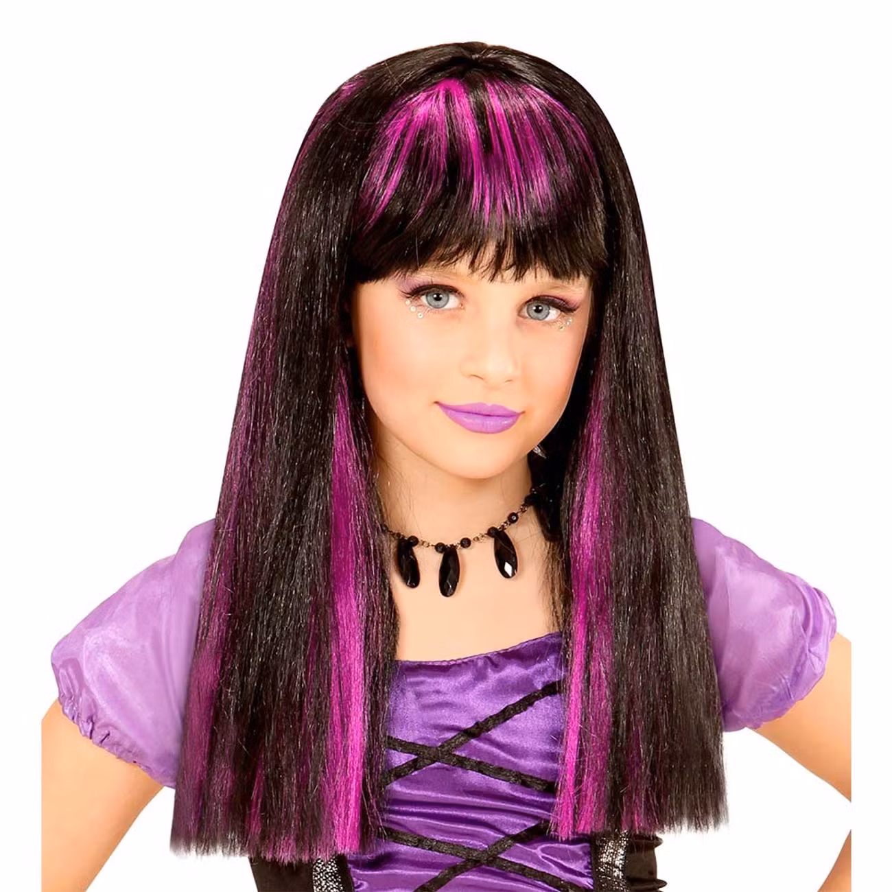 Svart/Lila Lång Barnperuk är en tjusig peruk som når ner över axlarna i svart med lila slingor. Perfekt för temafester, halloween eller när du bara känner för att göra världen lite mer färgglad. Komplettera gärna med peruknät.