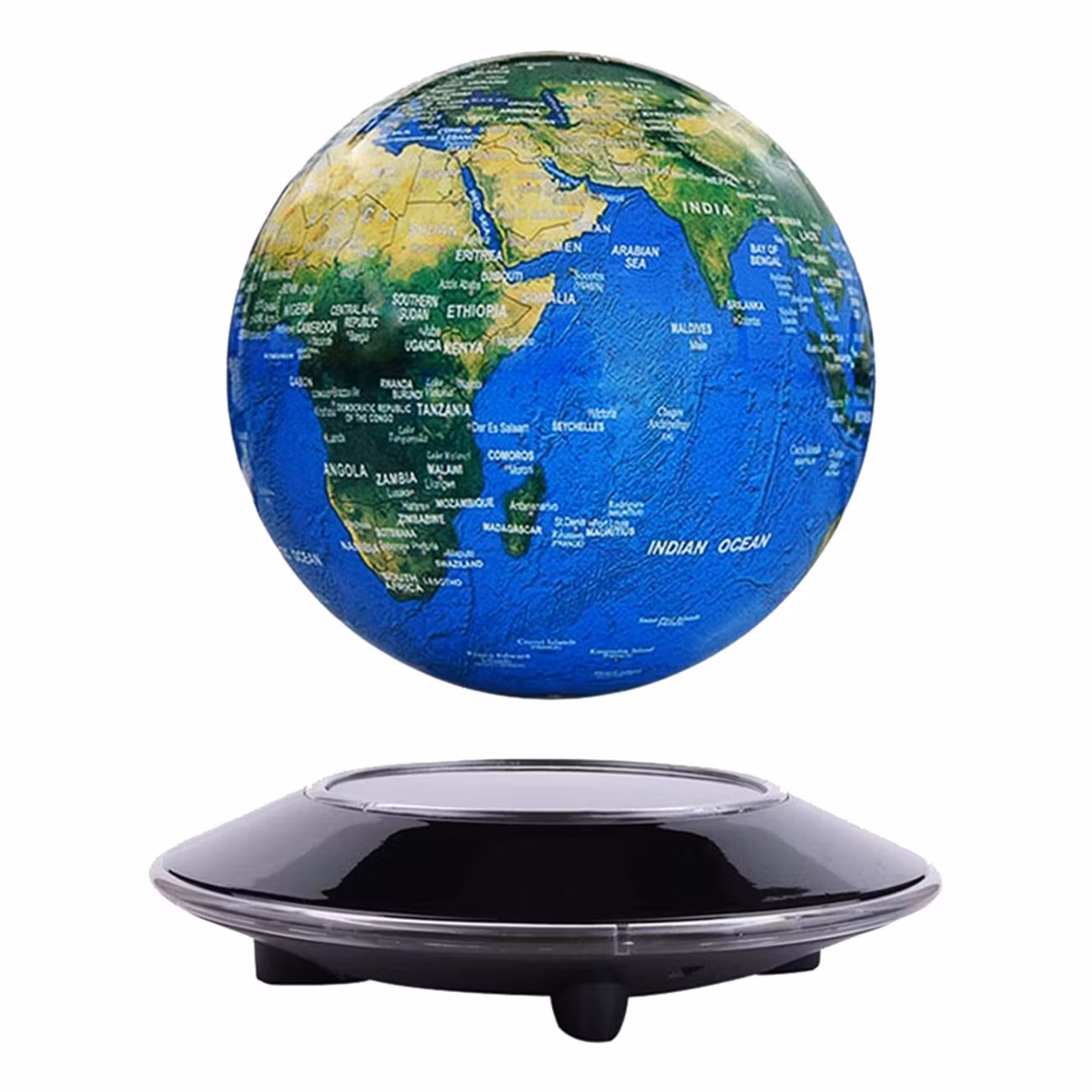 Svävande Jordglob är en jordglob som svävar och roterar på samma vis som vår planet gör med hjälp av elektromagneter. Plattformen som globen svävar från har en stilren, modern design och ger ifrån sig ett starkt LED-ljus och kan därmed användas som belysning. Det är engelsk text på globen. Den är tillverkad av ABS-plast och metall. Mäter ca 18,5 cm i omkrets och ca 20 cm hög. Den kopplas in i eluttag för att fungera, strömbrytare medföljer. Säljs styckvis.