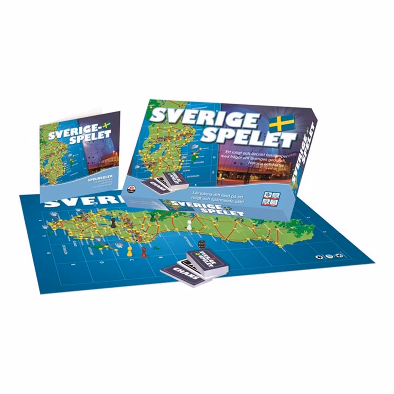 Hur spelar man Sverigespelet? Spelet består av ett spelbord i form av en sverigekarta med stora och mellanstora städer samt färg- och flygturer. Varje spelare får 16 stycken städer tilldelade till sig som han eller hon skall besöka under spelets gång. Varje spelare skall helt enkelt planera en förnuftig resebana för att hinna besöka och "lära" sig nya saker om sina städer före alla andra! Under resans gång gäller det också att ha lite flyt med tärningarna och chans-korten. Lite kunskap kan också vara bra att ha!