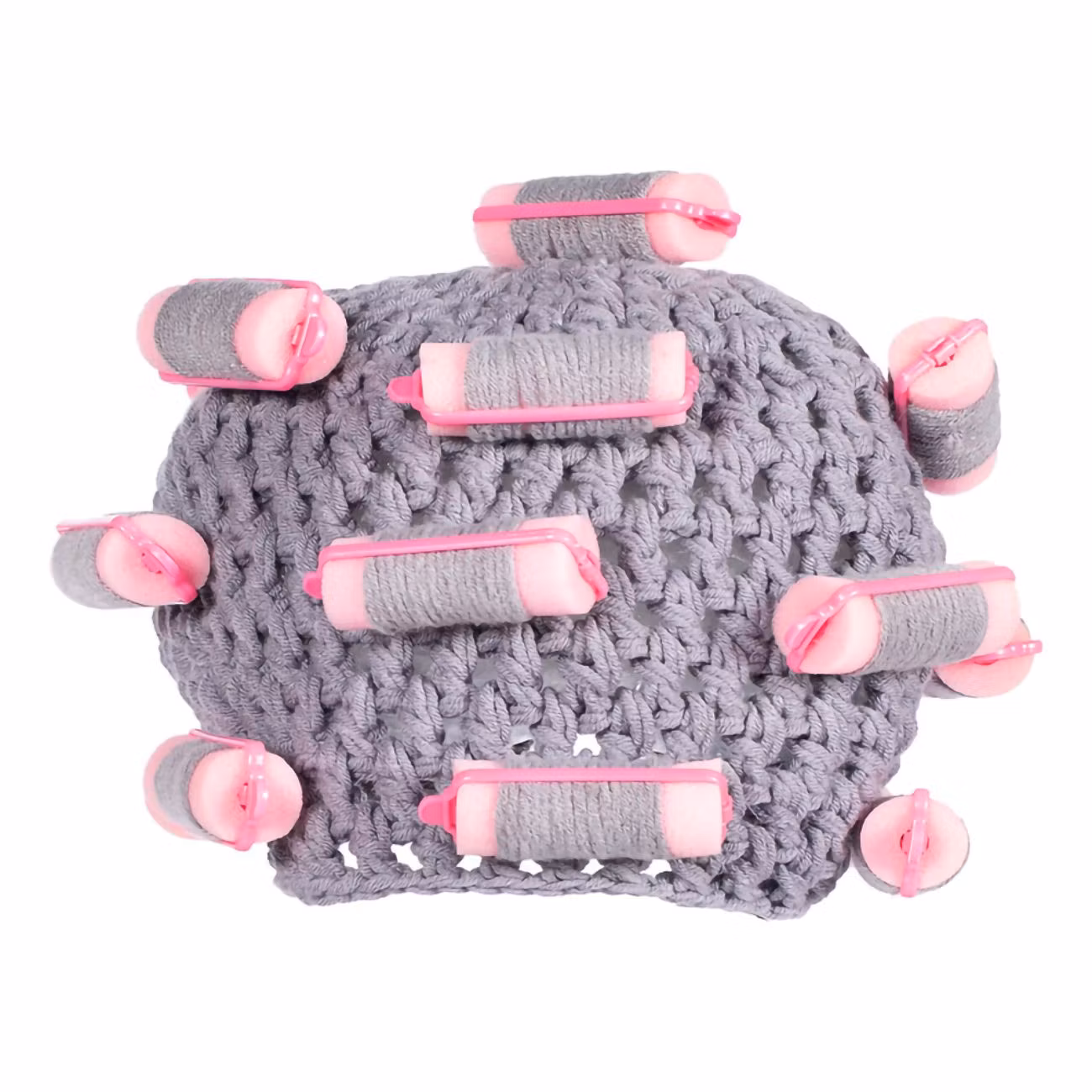 Äntligen kan du förvandla dig till kvarterets skvallerdrottning. Den här hatten är utformad som en klassisk tantmössa med fastsydda färgglada hårrullar som sticker fram, precis som om du var mitt i en hemmafixad permanent.