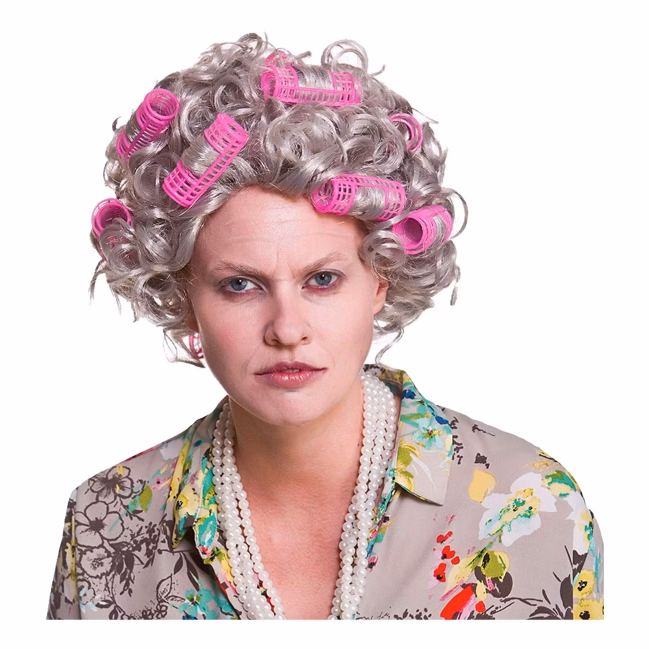 Tant Peruk med Hårrullar är en rolig peruk som hjälper dig att åldras 30-40 år. Peruken är grå, krullig och har flertalet rosa hårrullar i sig. En typiskt tantfrisyr får man väl ändå lov och säga? Peruken sitter superskönt och passar till alla typer av maskerader och halloweenfester!