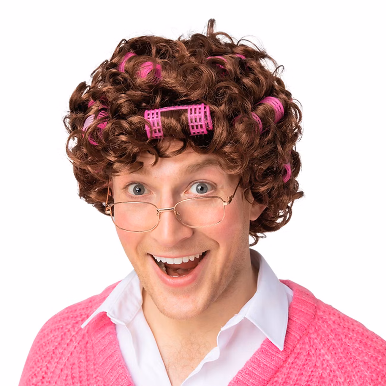 Tantperuk med Hårrullar är en peruk med brunt hår upprullat på rosa papiljotter. Komplettera gärna med ett peruknät så sitter peruken bra på plats. Det är bara peruken med papiljotter som ingår, inget annat som syns på bilden.