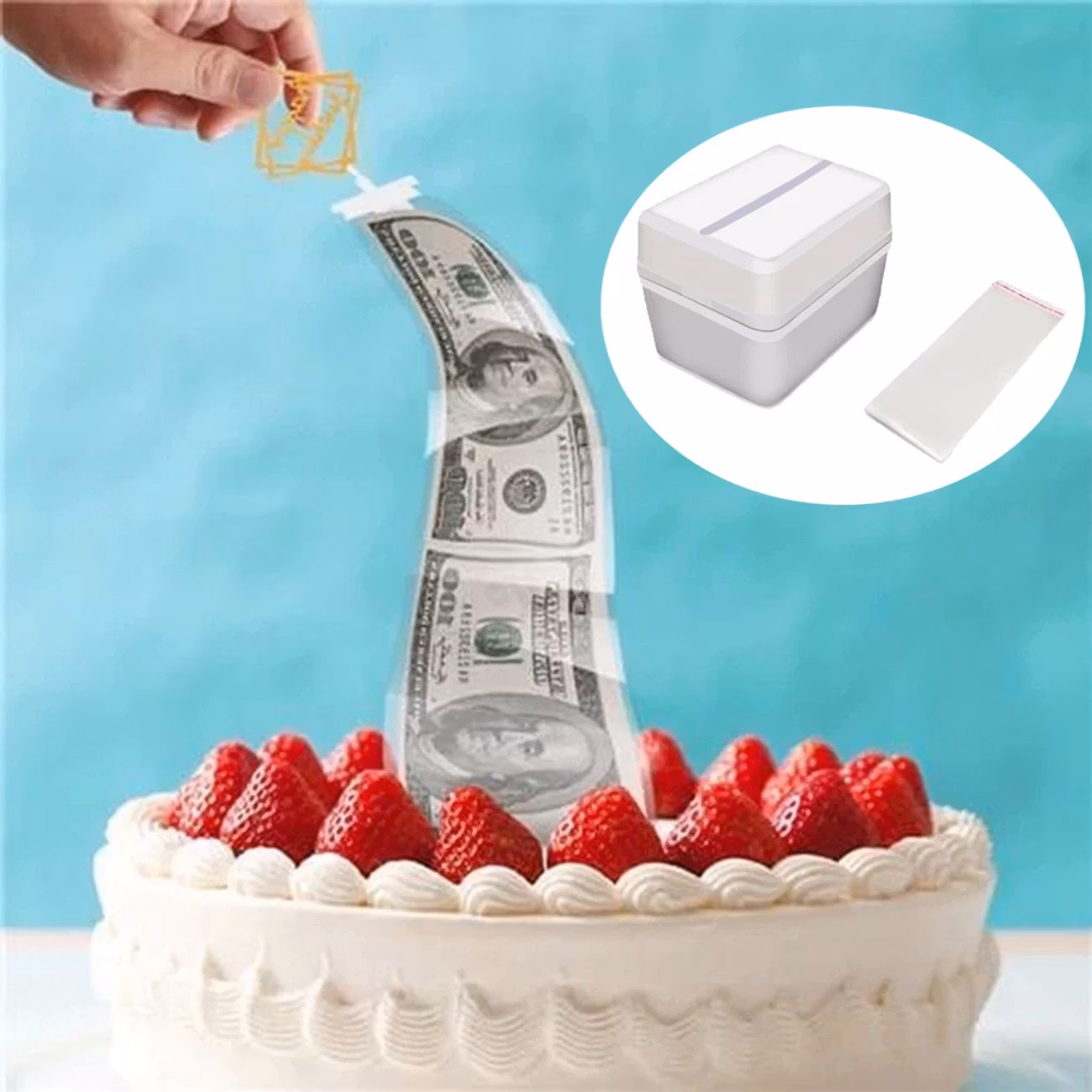 Fantastiskt smart produkt som "gömmer" undan pengar i födelsedagstårtan. Placera plastboxen i mitten av tårtan, dekorera tårtan och dölj burken med exempelvis grädde och jordgubbar, sedan får födelsedagsbarnet dra ut den långa plastremsan som innehåller pengar, eller kanske innehåller den stadsobligationer? Oavsett vad remsan innehåller så blir det en rolig grej till födelsedagskalaset!