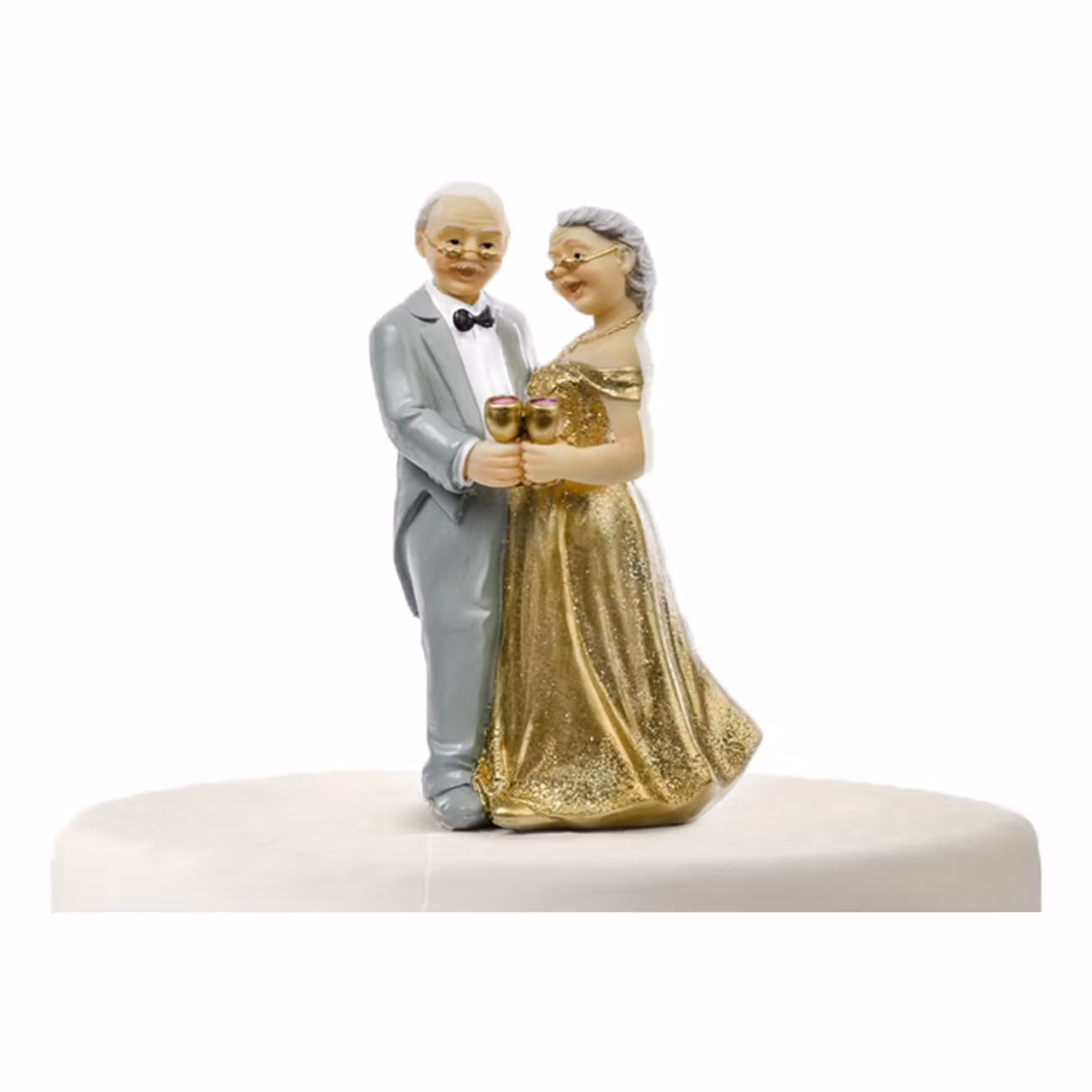 Det finns en hel lista med namn på bröllopsdagar! Silke, skiffer, tegel, aluminium och gummi för att nämna några. Men det mest åtråvärda måste ändå vara guldbröllopet, som firas om man har varit gift i hela 50 år! Har man varit gift så länge ska det självklart firas, och det gör man bäst med en maffiga tårta! Placera den här tårtfiguren på toppen för att sätta guldkant på den stora dagen!