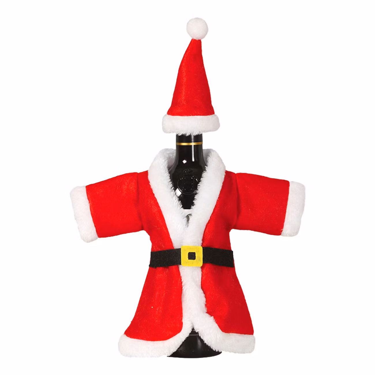 Tomtedräkt Flaskklädsel består av en röd tomtedräkt med vitt fluff, bälte och en matchande tomteluva som passar t ex vinflaskor. Dräkten trär du enkelt över flaskan och placerar luvan på toppen av flaskan.